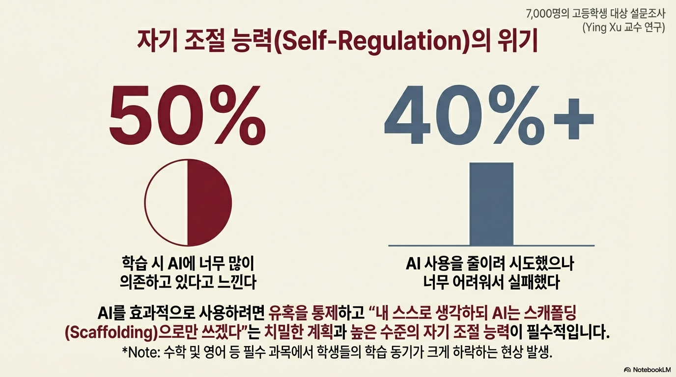 하버드 교육대학원의 잉 쉬(Ying Xu) 교수는 AI 도구가 유비쿼터스화된 환경에서 가장 시급한 역량으로 '자기 조절 능력'을 꼽았습니다. 7,000명의 고등학생을 대상으로 한 설문 조사 결과는 충격적입니다. 약 50%의 학생이 AI에 과도하게 의존하고 있다고 답했으며, 40% 이상은 AI 사용을 줄이려 시도했지만 유혹을 이기지 못해 실패했다고 고백했습니다.