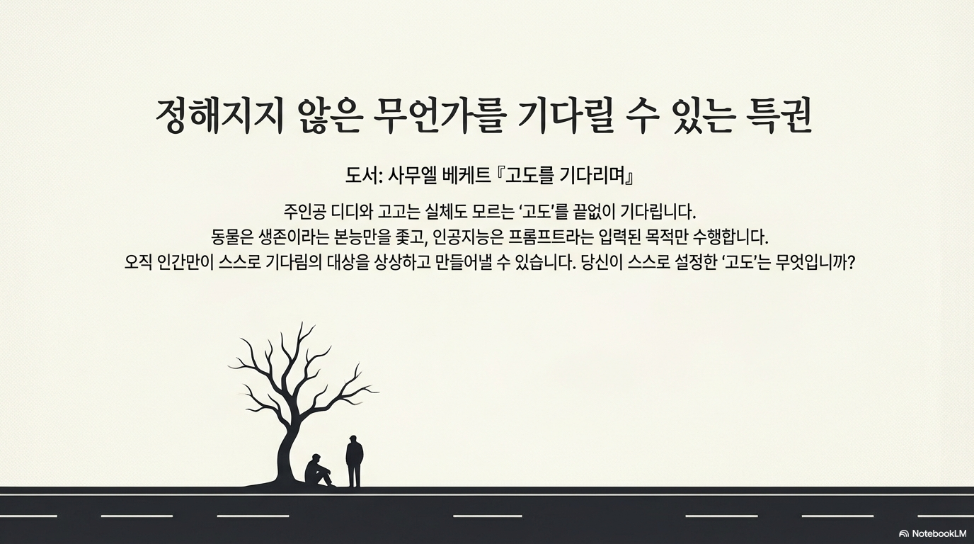 인생은 어쩌면 영원히 나타나지 않을 고도를 기다리는 허무한 과정일 수 있습니다. 그러나 그 '기다림'이라는 서사 자체가 삶을 지속하게 하는 강력한 동력이 됩니다. 무에서 유의 의미를 창조하고, 나만의 고도를 상상하는 능력은 본능과 알고리즘을 벗어난 존재만이 누릴 수 있는 고통스러운 위대함입니다.