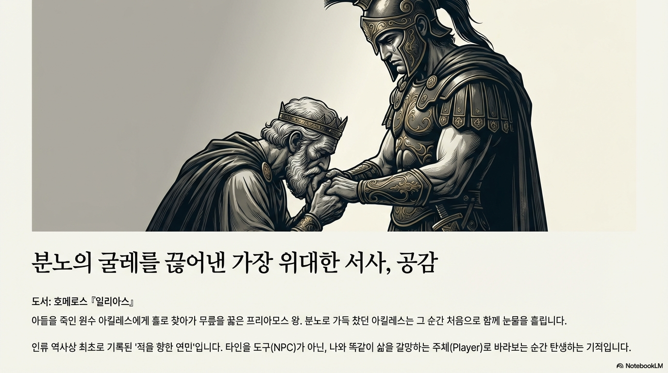 <일리아스>는 분노로 시작해 연민으로 끝나는 대서사시입니다. 아킬레스가 원수 프리아모스 왕의 손을 잡고 함께 눈물을 흘리는 대목은 인류가 발명한 가장 인간적인 능력인 '공감'을 보여줍니다. 타인의 불행에서 상대적 행복을 느끼는 '콜로세움'의 잔혹한 본능이 현대 사회를 지배하고 있지만, 역설적으로 우리의 생존 열쇠는 다시 '연민'에 있습니다.