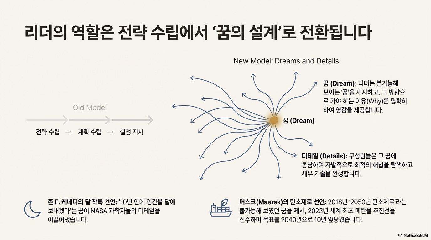 이러한 변화는 리더십의 본질을 뒤바꿉니다. 불확실성이 극대화된 시대에 정교한 '전략'을 세우는 것은 점점 무의미해지고 있습니다. 대신 리더는 구성원이 함께 몰입할 수 있는 원대한 '꿈'을 제시해야 합니다. 예측 불가능한 상황일수록, 나아가야 할 방향을 명확히 담은 꿈이 구성원에게 영감과 의미를 부여하고, 자발적으로 최적의 해법을 찾도록 이끌기 때문입니다.