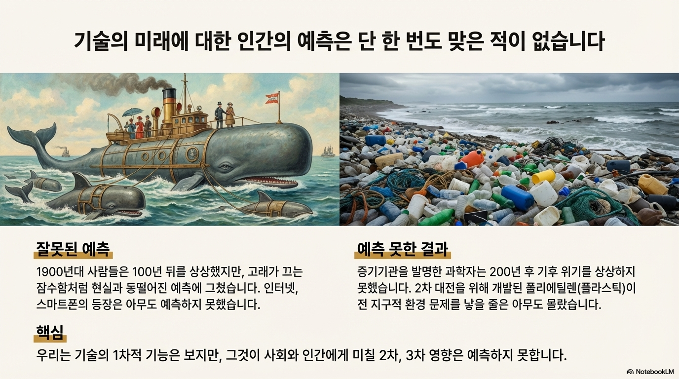 이 사례는 새로운 기술의 미래를 섣불리 예측하고 변화를 쫓는 것이 얼마나 위험한지를 보여줍니다. 우리는 기술의 장기적 영향을 예측하는 데 번번이 실패해왔습니다. 더 심각한 것은, 우리가 예측하지 못한 ‘부작용’입니다. 사회심리학자 조나선 하이트의 연구에 따르면, 스마트폰이 보급된 2010년에서 2015년 사이 서구 10대들의 우울증과 자살률이 3배 이상 급증했습니다. 어른들은 SNS를 ‘소통’의 도구라 믿었지만, 아이들에게는 자신을 끊임없이 전시하고 비교하며 ‘좋아요’ 개수에 스트레스받는 강박적인 ‘노동’이었습니다. 10년이 지난 지금에야 우리는 스마트폰이 아이들에게 미친 파괴적인 영향을 깨닫고 규제를 논의하기 시작했습니다. 인공지능의 예측 불가능성은 이보다 훨씬 더 클 것입니다.