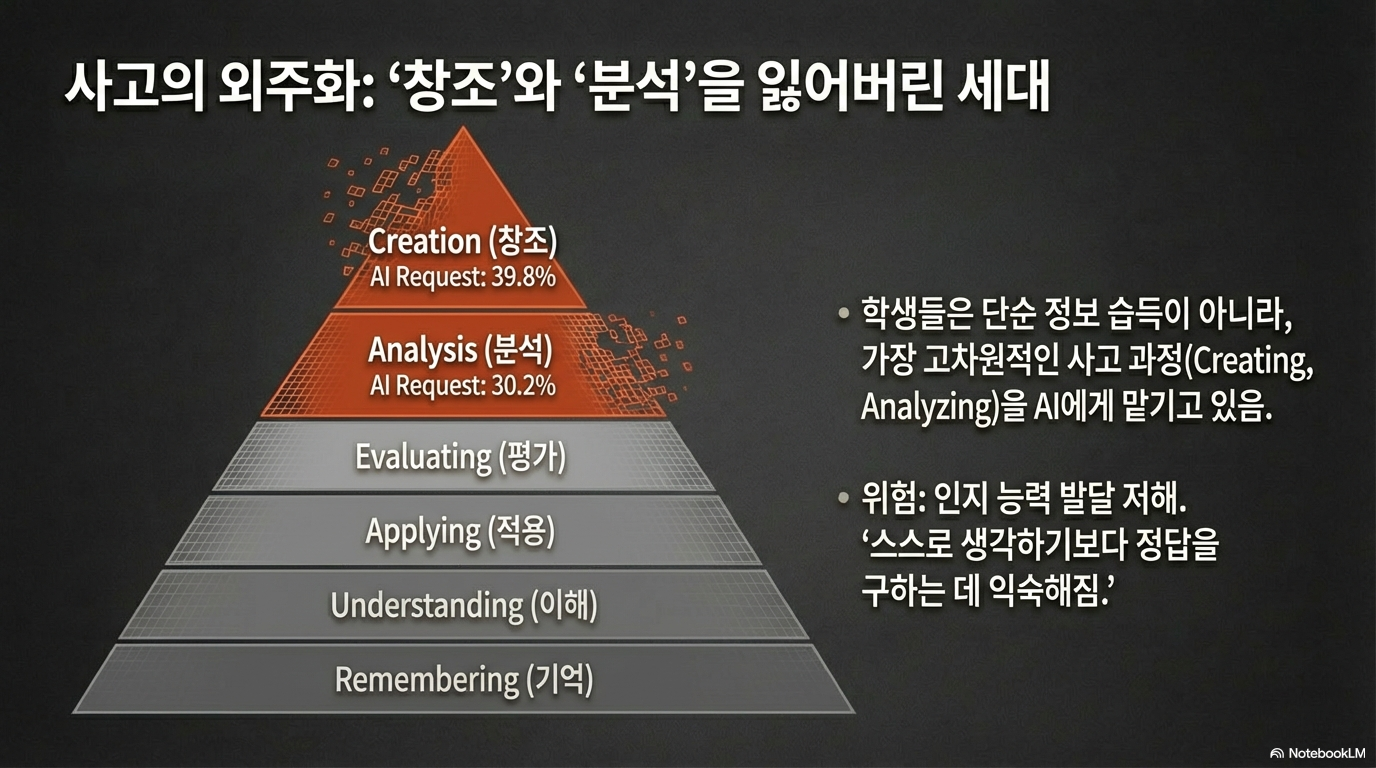 이 결과는 AI가 정답이라는 '마약'을 즉시 주사함으로써, 학생들이 반드시 거쳐야 할 지적 성장의 고통을 원천적으로 제거해버린다는 점을 시사합니다. 실제로 앤트로픽의 연구에 따르면, 학생들이 AI에게 가장 많이 하는 질문은 '창조', '분석'과 같이 고차원적인 사고 능력을 요구하는 작업들이었습니다. 이는 우리가 생각하는 과정 자체를 AI에게 '외주화'하고 있음을 의미합니다.