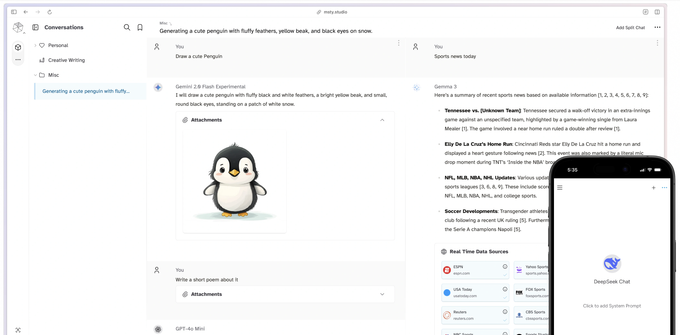 Msty는 멀티버스 채팅 기능을 통해 GPT-4o, Claude 3.5/3.7, Gemini 1.5, Mistral, LLaMA 3, Command R+ 등 여러 모델을 동시에 구동하고 같은 질문에 대한 각 모델의 답변을 나란히 비교할 수 있습니다.