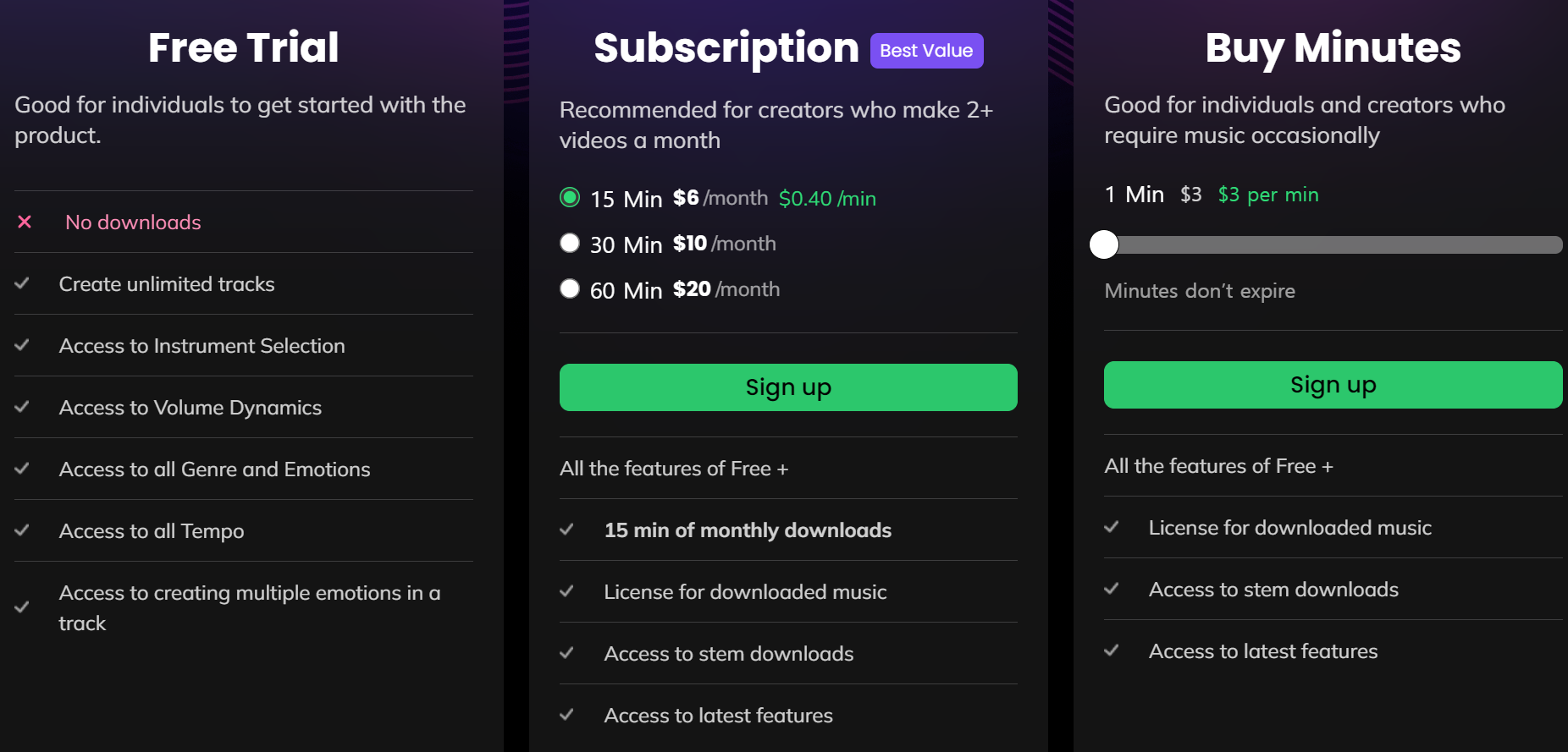 고급 기능 구독: 고급 기능을 사용하려면 구독이 필요하며 이는 모든 사람의 예산에 맞지 않을 수 있습니다. - Soundraw:
