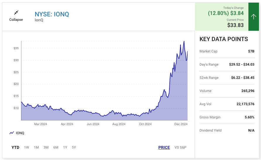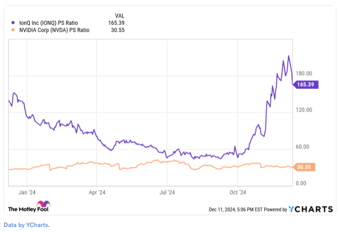- IonQ의 주가는 과대평가된 경향이 있습니다. IonQ의 주가 대비 매출 비율(P/S)은 최근 급등하여 Nvidia보다 훨씬 높은 수준을 보이고 있습니다.