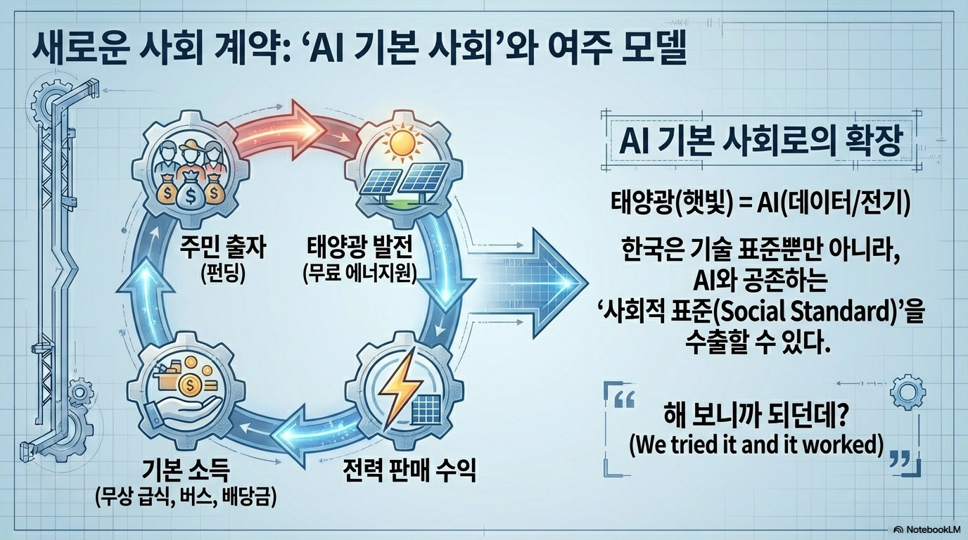 하지만 이 위기는 ‘AI 기본 사회’라는 새로운 사회 계약의 가능성을 엽니다. 여주의 ‘구양리 태양광 마을’은 그 희망의 축소판입니다. 주민들이 공동으로 설치한 태양광 발전 수익으로 매일 무료 점심을 먹고 마을 버스를 운영하는 것처럼, AI가 생산하는 부를 공동체가 공정하게 분배하는 모델이 가능합니다. 박태웅 의장의 말처럼, “재생에너지로 그게 된다면, AI는 왜 안 되겠습니까? 거기보다 훨씬 풍족하게 기본소득을 받을 수 있습니다.” 한국의 AI 생태계가 창출할 부는 일자리의 위협을 넘어, 모든 구성원의 기본적인 삶을 보장하는 풍요로운 사회의 재원이 될 수 있습니다.