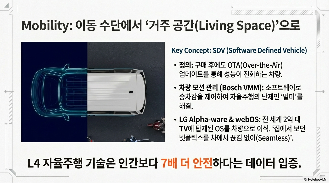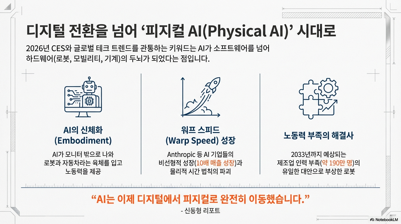 오랫동안 인공지능(AI)은 디지털 화면이라는 유리 감옥에 갇힌 똑똑한 유령과 같았습니다. 우리는 그저 화면을 통해 그 지능을 엿볼 뿐이었습니다. 하지만 CES 2026은 그 감옥의 유리가 마침내 깨졌음을 선포하는 현장이었습니다. 올해의 핵심 주제는 단순한 점진적 개선이 아니었습니다. AI가 우리의 가정과 자동차, 심지어 우리 몸이라는 물리적 세계로 직접 걸어 나오기 시작했다는 근본적인 패러다임의 전환이었습니다. 여기, 우리의 일상을 재편할 준비를 마친 CES 2026의 가장 충격적인 5가지 통찰을 소개합니다.