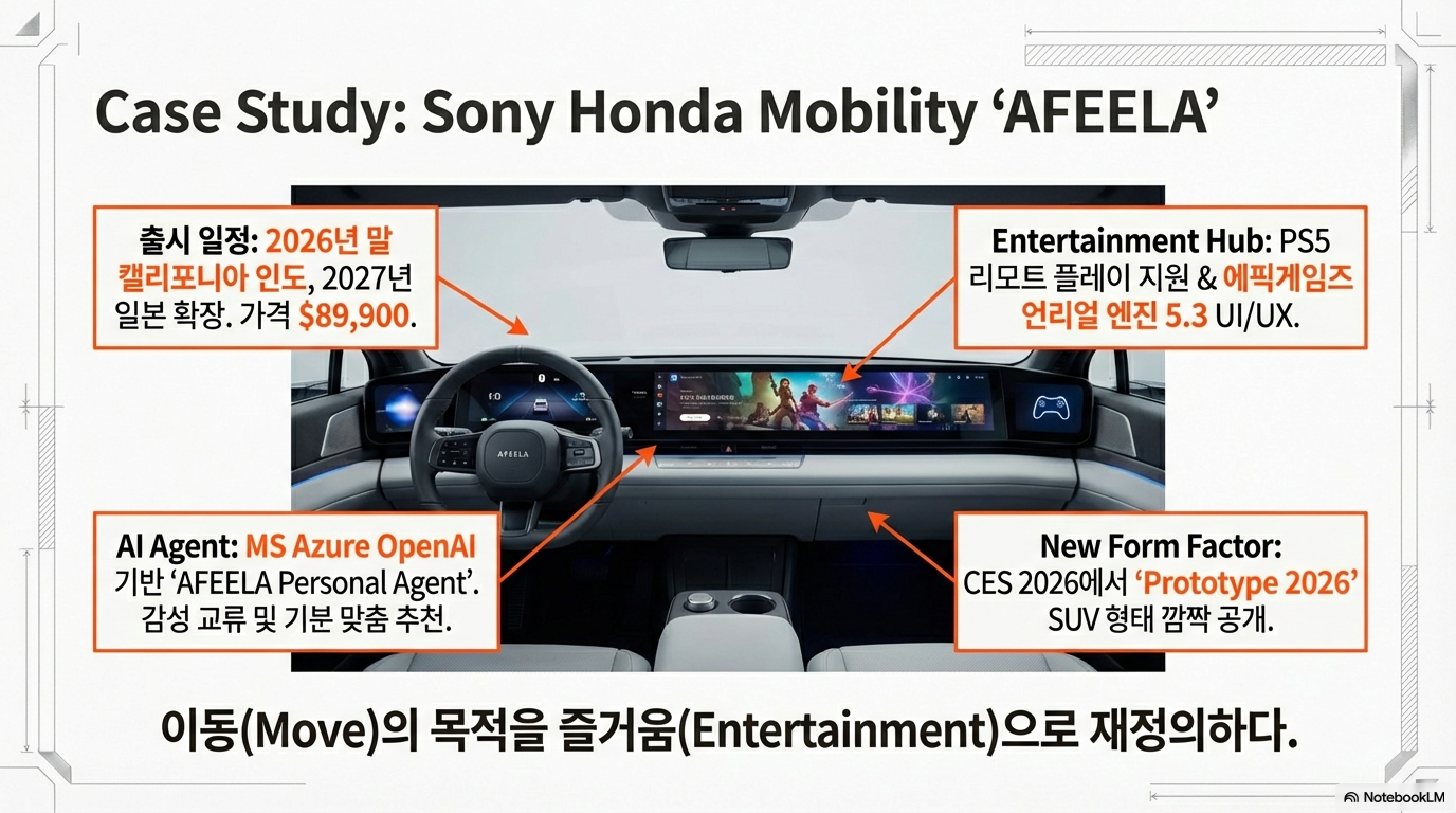 CES 2026은 '자동차'라는 개념이 종말을 고하고 있음을 분명히 보여주었습니다. 그 중심에는 소니 혼다 모빌리티(SHM)의 '아필라(AFEELA)'가 있습니다. SHM은 아필라를 전통적인 자동차가 아닌 '창의적인 엔터테인먼트 공간(Creative Entertainment Space)'이자 '움직이는 엔터테인먼트 허브'로 정의합니다.