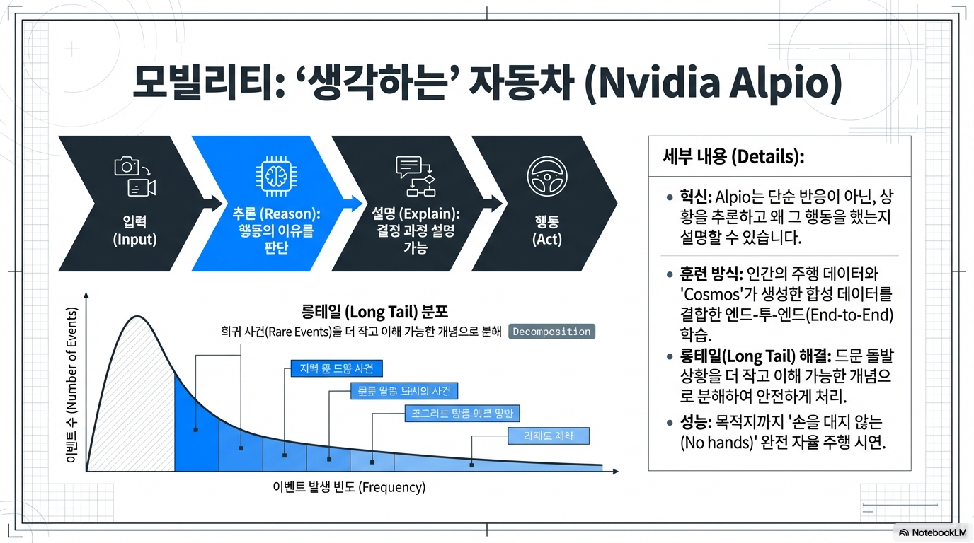 Alpio는 단순히 센서 데이터를 기반으로 조향하고 제동하는 것을 넘어섭니다. 이 AI는 자신이 어떤 행동을 하려 하는지, 그리고 그 이유가 무엇인지 스스로 '추론(reasons)'하고 우리에게 '설명'하는 능력을 갖추고 있습니다. 젠슨 황은 이 능력의 중요성을 이렇게 설명했습니다.