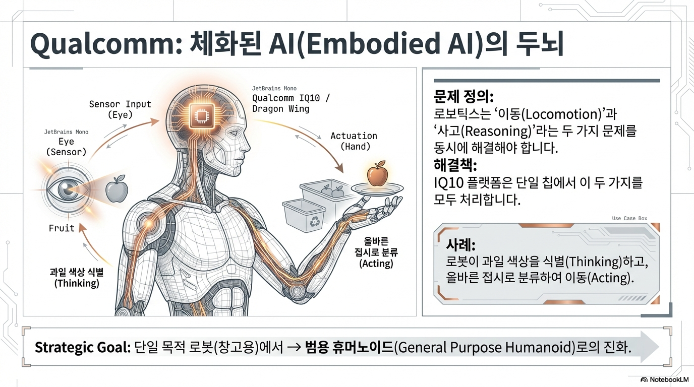 CES 현장에는 LG의 가사 로봇처럼 대중의 시선을 사로잡는 로봇들이 많았습니다. 하지만 현실적으로 이들의 움직임은 아직 느리고 "까다로운(finicky)" 수준에 머물러 있습니다. 그렇다면 로봇 기술의 진정한 돌파구는 어디일까요? 퀄컴의 CFO는 그 답이 '특수 목적 휴머노이드(special purpose humanoids)'에 있다고 명확히 제시했습니다.