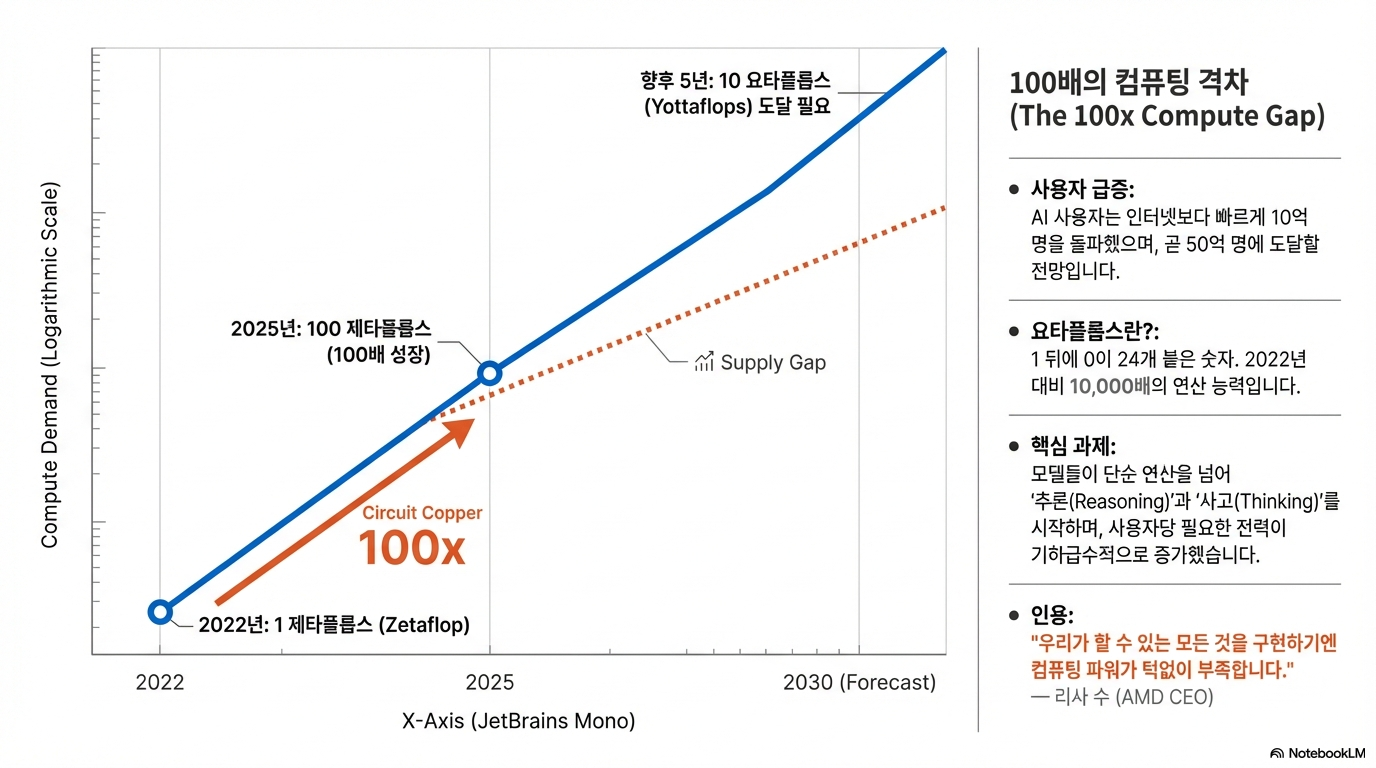 AI가 똑똑해질수록 더 많은 것을 요구합니다. 바로 '컴퓨팅 파워'입니다. 이번 CES 2026에서 AMD의 CEO 리사 수는 AI가 필요로 하는 연산 능력이 얼마나 폭발적으로 증가하고 있는지 충격적인 수치로 보여주었습니다. 그녀는 전 세계 컴퓨팅 인프라가 2022년 약 1 제타플롭스(Zetaflop)에서 2025년 100 제타플롭스로 증가했으며, 향후 5년 내에는 현재의 100 제타플롭스에서 다시 100배를 더 늘려 '10 요타플롭스(Yottaflops)' 이상의 연산 능력이 필요할 것이라고 예측했습니다.