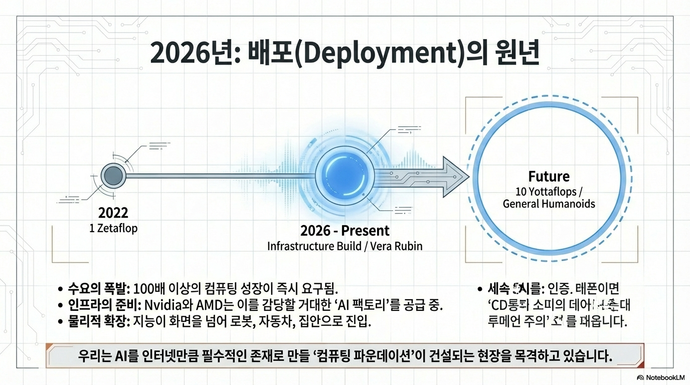 CES 2026이 보여준 네 가지 신호는 하나의 통일된 조립 라인과 같습니다. 요타플롭스 규모의 폭발적인 컴퓨팅 파워 수요(신호 1)는 더 이상 이론이 아닌 대량 생산 단계에 진입한 하드웨어(신호 2)에 의해 충족되고 있습니다. 이 강력한 힘은 자동차와 같은 물리적 기계에 '추론'하는 능력(신호 3)을 부여하고, 우리 산업을 위해 지치지 않는 새로운 계층의 특화된 노동자(신호 4)를 만들어내고 있습니다. 이것은 네 개의 개별적인 트렌드가 아니라, 미래를 만들어내는 하나의 거대한 흐름입니다.