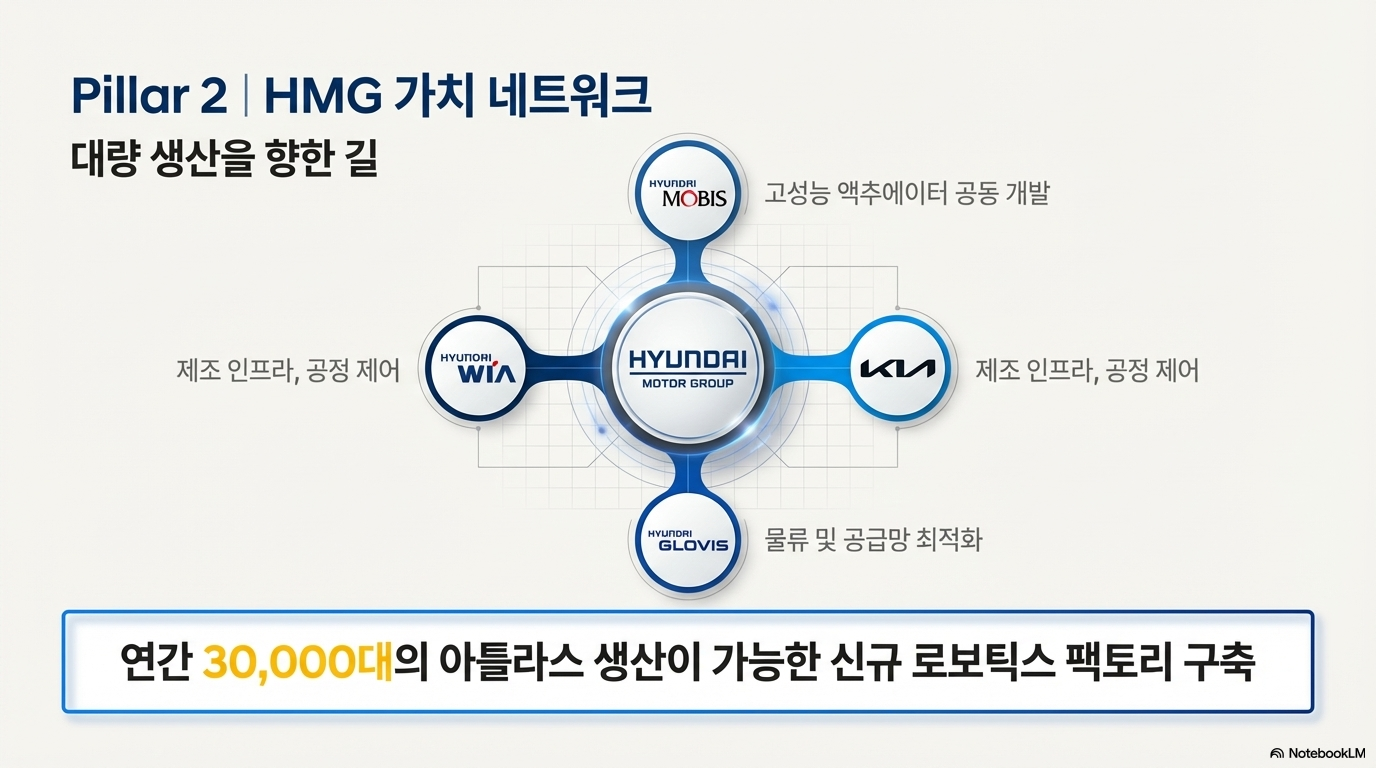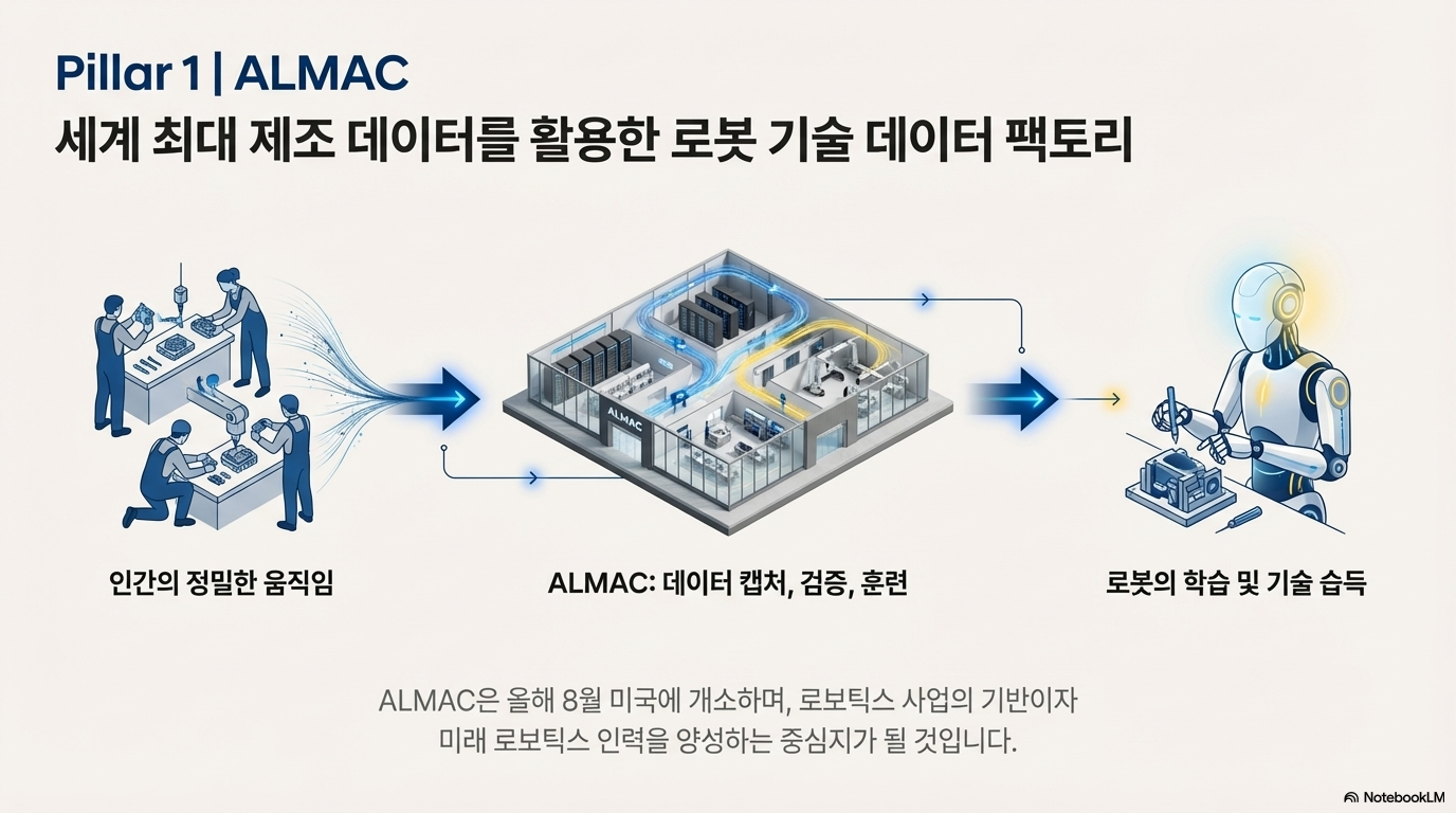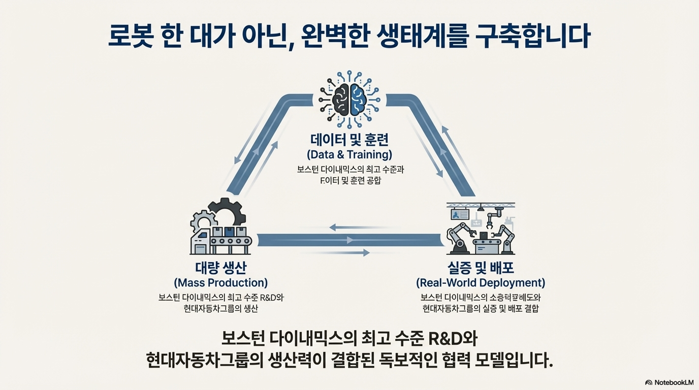 특히 주목할 점은 현대자동차그룹이 단순히 아틀라스의 구매 고객에 머무는 것이 아니라, 직접 생산을 담당한다는 사실입니다. 이는 두 회사 간의 파트너십이 얼마나 깊고 통합적인지를 보여줍니다. 이러한 규모는 단순히 하드웨어 생산에 그치지 않습니다. 이는 전 세계 로봇의 AI를 훈련하고 개선하기 위한 독보적인 '데이터 팩토리(data factory)'를 구축하여, 시간이 지날수록 강력해지는 경쟁 우위를 창출하려는 거대한 계획입니다.