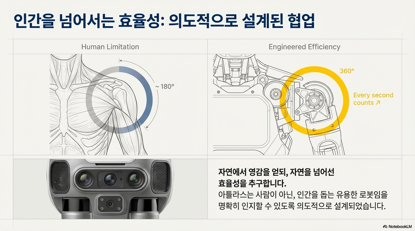 아틀라스는 '휴머노이드' 형태를 하고 있지만, 그 설계 철학은 인간의 생물학적 구조를 모방하는 것이 아니라 산업 현장의 효율성을 극대화하는 데 초점을 맞추고 있습니다. 이는 매우 역발상적인 접근 방식입니다.