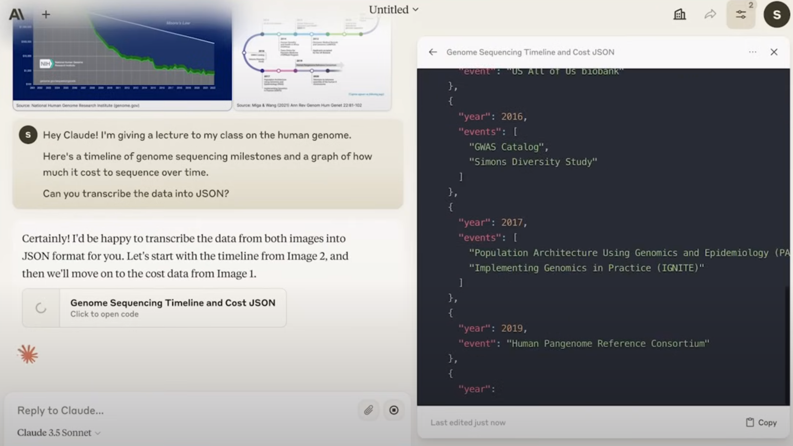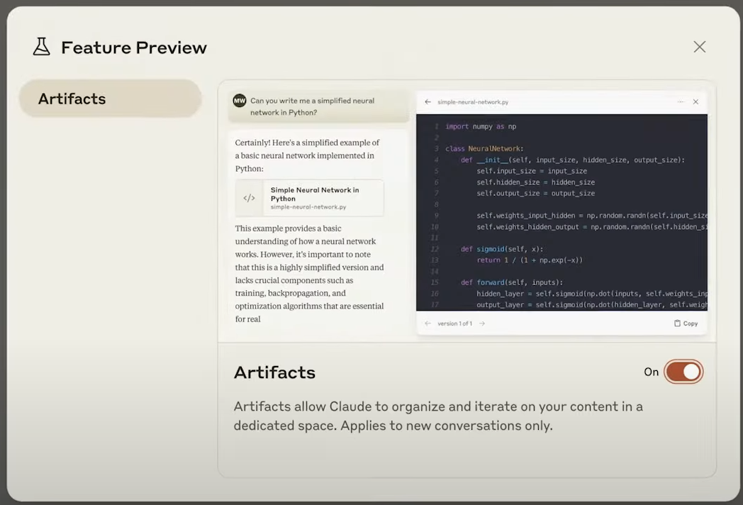 오늘 우리는 Claude.ai에서 사용자가 Claude와 상호 작용할 수 있는 방식을 확장하는 새로운 기능인 Artifacts를 도입합니다. 사용자가 코드 스니펫, 텍스트 문서 또는 웹사이트 디자인과 같은 콘텐츠 생성을 Claude에게 요청하면 이러한 Artifacts는 대화와 함께 전용 창에 나타납니다. 이는 사용자가 Claude의 창작물을 실시간으로 보고, 편집하고, 프로젝트 및 워크플로우에 AI 생성 콘텐츠를 원활하게 통합할 수 있는 동적 작업 공간을 만듭니다.