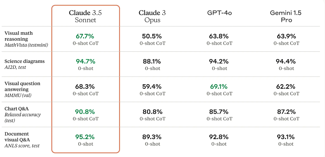 Claude 3.5 Sonnet은 표준 비전 벤치마크에서 Claude 3 Opus를 능가하는 우리의 가장 강력한 비전 모델입니다. 이러한 단계적 개선은 차트 및 그래프 해석과 같은 시각적 추론이 필요한 작업에서 가장 두드러집니다. Claude 3.5 Sonnet은 불완전한 이미지에서 텍스트를 정확하게 전사할 수 있으며, 이는 AI가 이미지, 그래픽 또는 일러스트레이션에서 텍스트만으로는 얻을 수 없는 더 많은 통찰력을 얻을 수 있는 소매, 물류 및 금융 서비스에서 핵심 기능입니다.