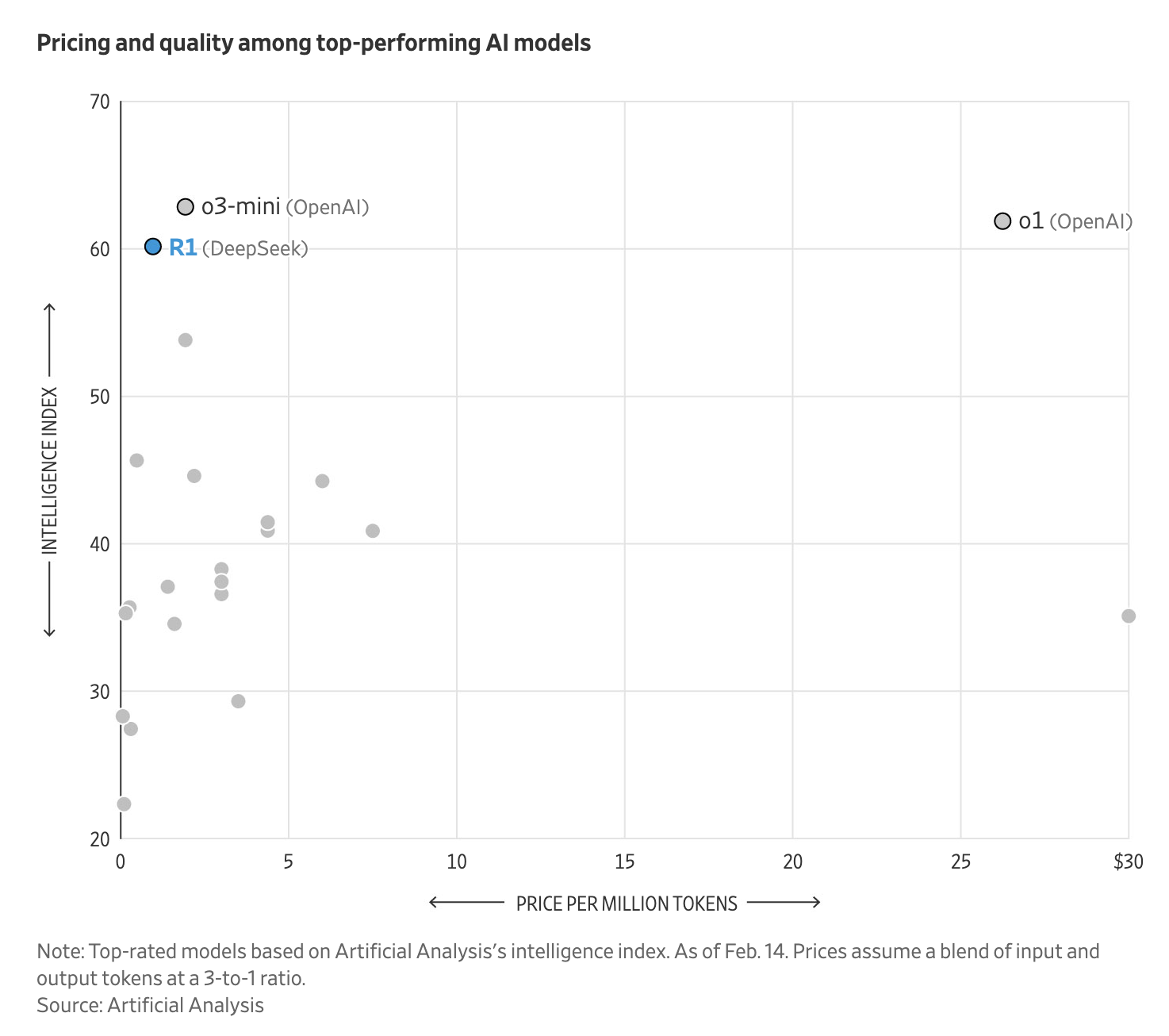 Artificial Analysis의 분석에 따르면, DeepSeek R1은 동급 AI 모델보다 20~30% 저렴한 가격을 책정했습니다.