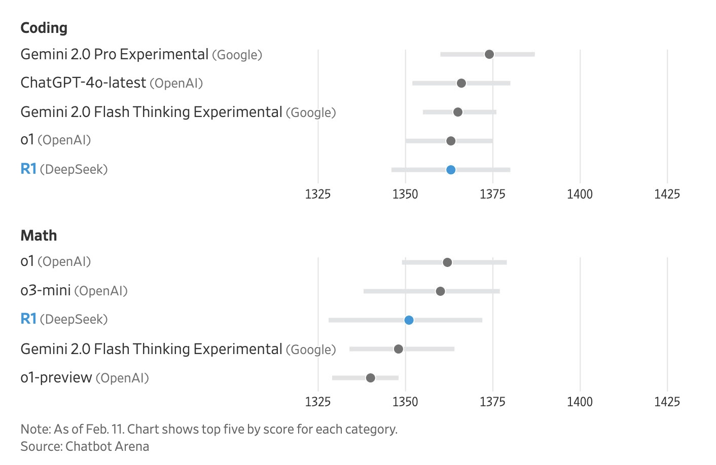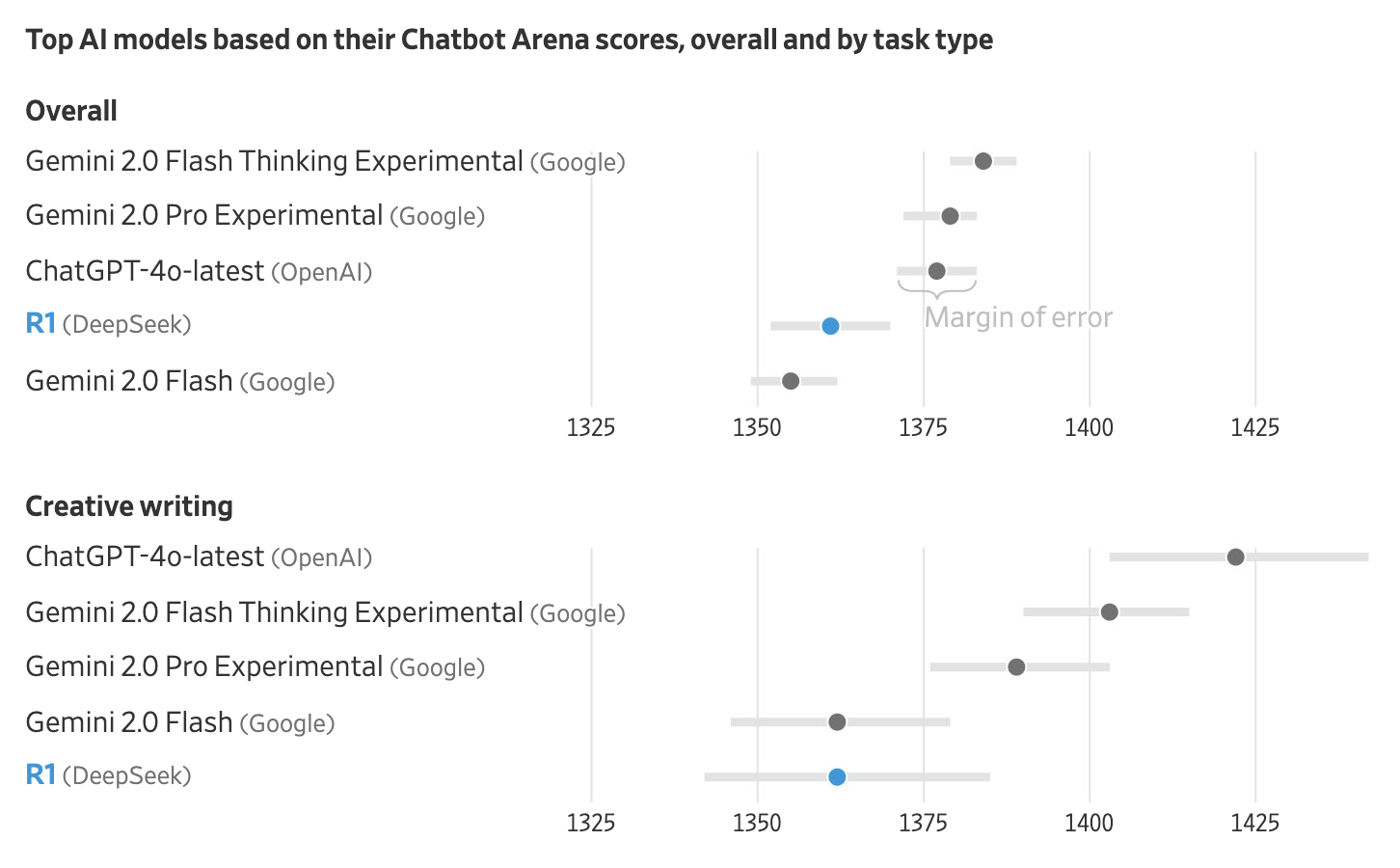 DeepSeek R1은 출시 직후 Chatbot Arena 상위권에 오르며, 다음과 같은 성과를 달성했습니다: