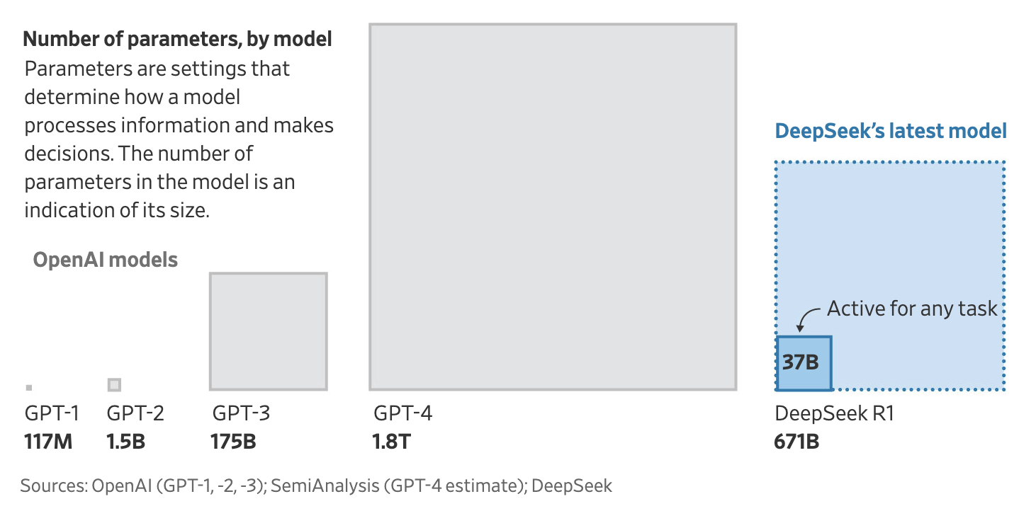 DeepSeek R1의 또 다른 특징은 **6710억 개의 파라미터(parameters)**를 활용한다는 점입니다. 파라미터는 AI 모델이 입력된 데이터를 바탕으로 출력 결과를 생성할 때 사용하는 가중치(weight)를 의미합니다.