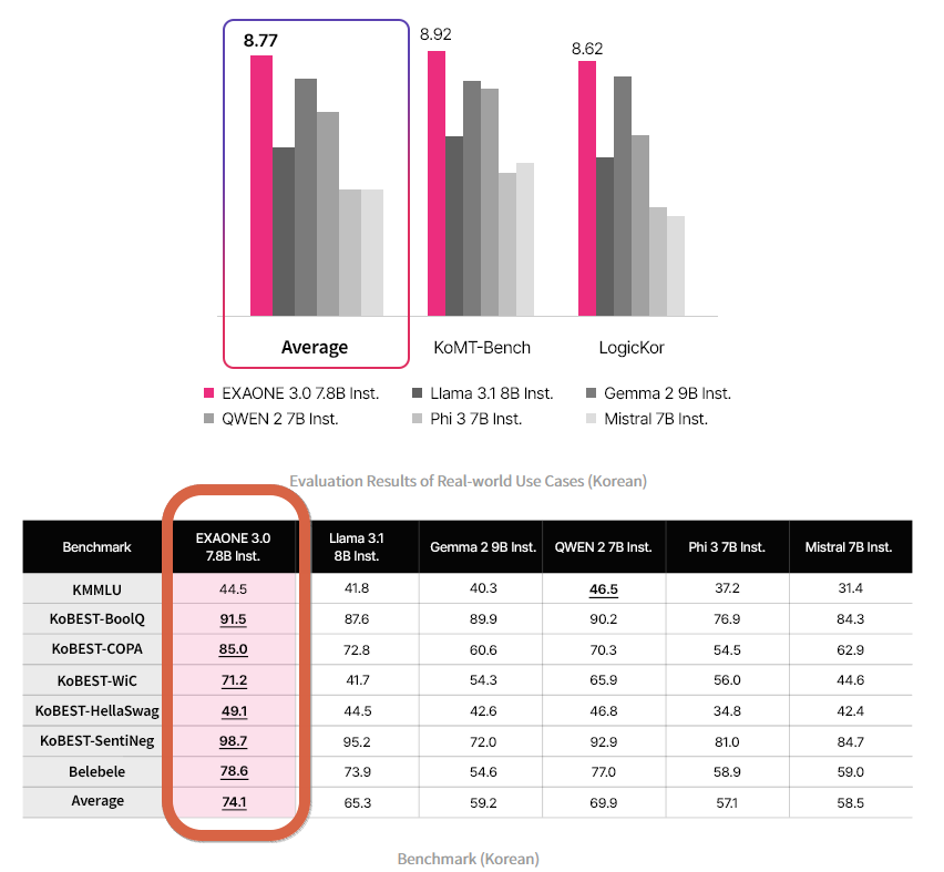 EXAONE 7.8B 모델은 영어와 한국어를 모두 타겟으로 하는 이중 언어 모델입니다. 한국어 성능 평가를 위해, 실세계 사용 사례를 확인하기 위해 두 가지 벤치마크를 사용했으며, 일반적인 성능을 확인하기 위해 여러 벤치마크를 구성했습니다. 그 결과, 실세계 사용 사례와 일반 성능 모두에서 최상위 결과를 확인할 수 있었습니다.