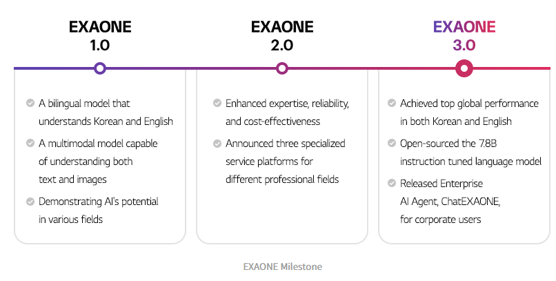 LG AI 연구소의 EXAONE은 지난 3년간 1.0 버전에서 3.0 버전으로 발전하며, 매년 업그레이드된 모델과 외부 상용화 결과를 발표하는 과정에서 쉽지 않은 여정을 걸어왔습니다. 다양한 산업에서 AI 기술 개발 잠재력을 하나씩 입증하면서, 성능과 비용 두 축 사이에서 사용자가 더 잘 활용할 수 있는 모델을 만들었으며, 실제 산업 현장에서 적용 가능한 전문가 수준의 AI를 개발했습니다.