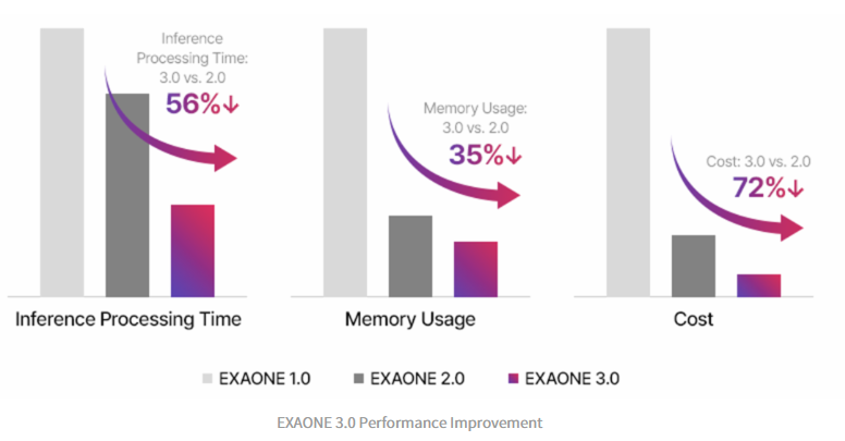 AI가 우리의 생활에 적용되기 위해서는 성능 향상뿐만 아니라 경제성 확보가 필수적입니다. 2021년 EXAONE 1.0 출시 이후, 우리는 AI 모델 압축 기술 연구개발에 집중하여 비용 효율성을 달성했습니다. 그 결과, 7.8B 모델은 EXAONE 2.0에 비해 추론 처리 시간이 56% 감소했으며, 비용은 72% 절감되었습니다. 특히, 초기 출시된 EXAONE 1.0의 비용의 6% 수준으로 비용을 크게 절감할 수 있었습니다.