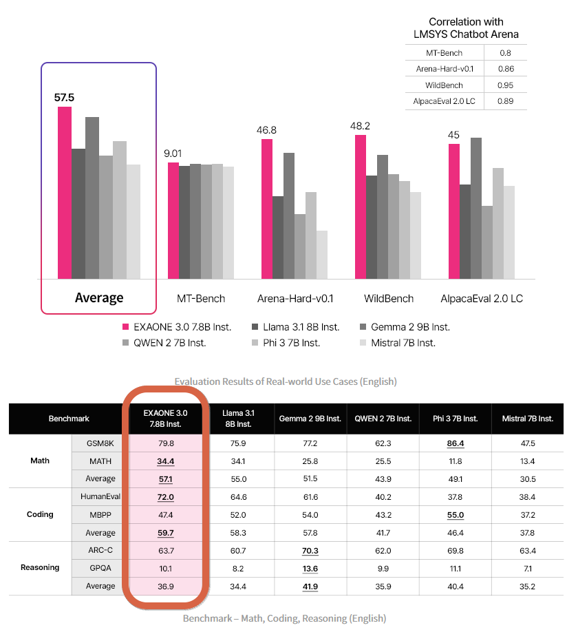 EXAONE 7.8B 모델은 영어와 한국어를 모두 타겟으로 하는 이중 언어 모델입니다. 한국어 성능 평가를 위해, 실세계 사용 사례를 확인하기 위해 두 가지 벤치마크를 사용했으며, 일반적인 성능을 확인하기 위해 여러 벤치마크를 구성했습니다. 그 결과, 실세계 사용 사례와 일반 성능 모두에서 최상위 결과를 확인할 수 있었습니다.