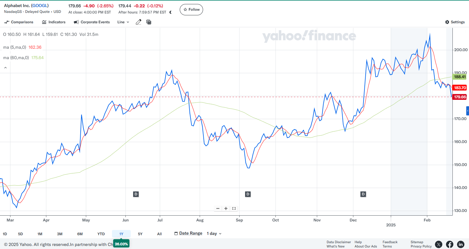 최근 1년간 GOOG의 주가 변동을 분석한 결과, 2024년 초 140달러 수준에서 2025년 초 180달러 이상으로 상승하는 등 강한 상승세를 보였습니다.