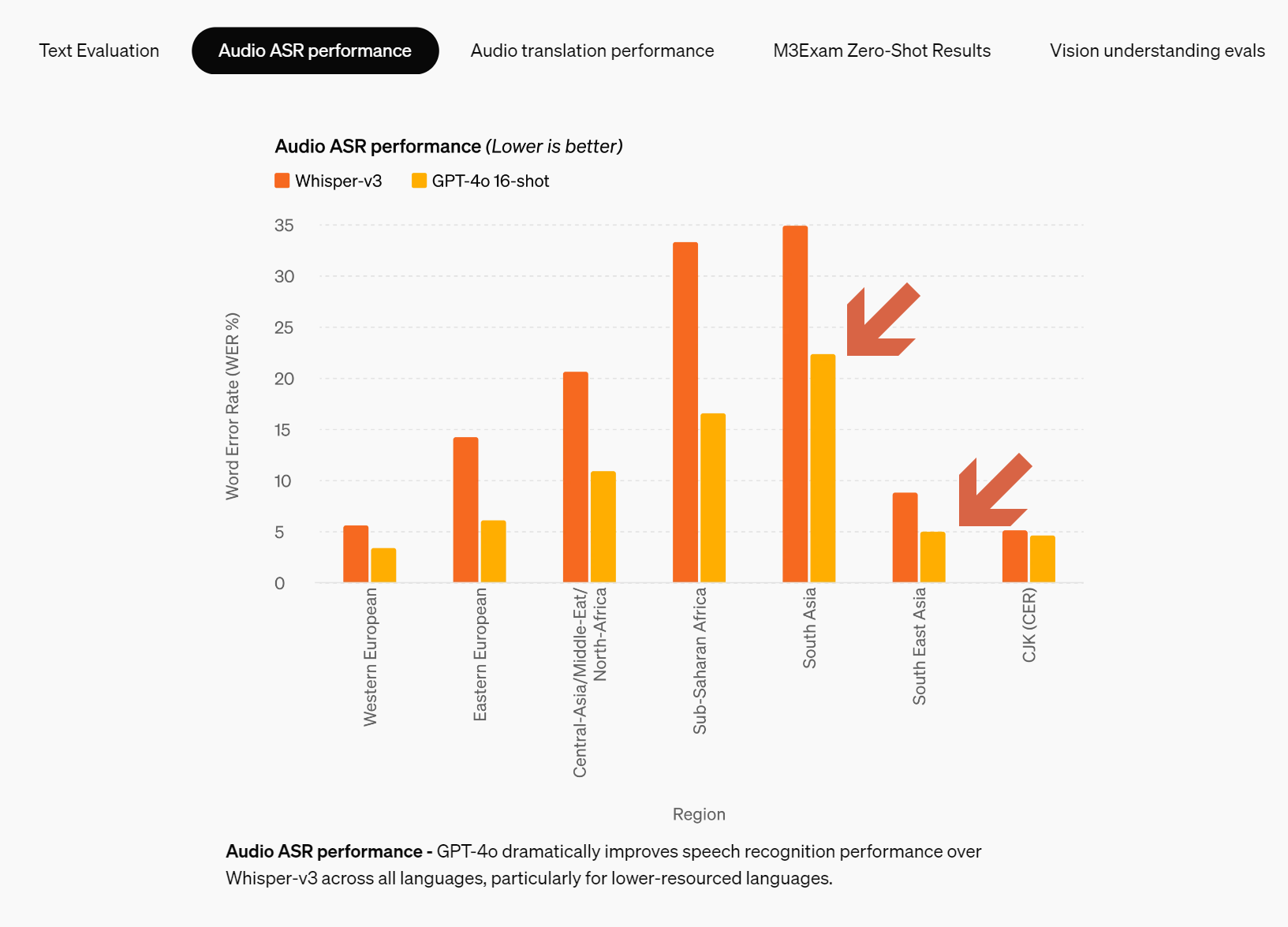 고급 AI를 전 세계적으로 더 쉽게 접근하고 유용하게 만들기 위해 GPT-4o의 언어 능력은 품질과 속도 면에서 향상되었습니다. ChatGPT는 이제 가입 및 로그인, 사용자 설정 등에서 50개 이상의 언어를 지원합니다.