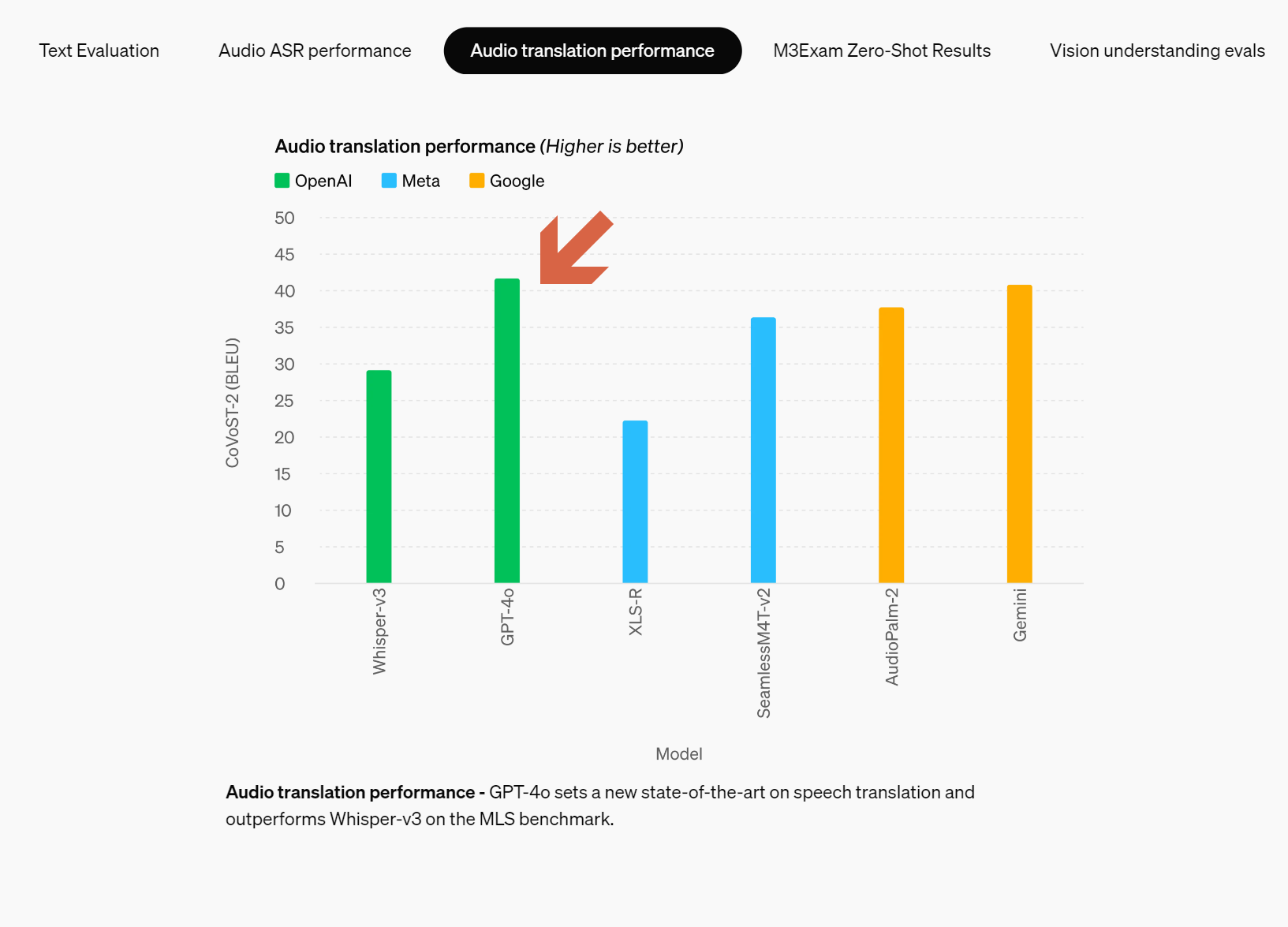 GPT-4o 이전에는 Voice Mode를 사용하여 ChatGPT와 대화할 때 평균 지연 시간이 GPT-3.5는 2.8초, GPT-4는 5.4초였습니다. 이를 위해 Voice Mode는 세 개의 별도 모델로 구성된 파이프라인을 사용했습니다. 첫 번째 간단한 모델은 오디오를 텍스트로 변환하고, GPT-3.5 또는 GPT-4가 텍스트를 입력받아 텍스트를 출력하며, 세 번째 간단한 모델이 그 텍스트를 다시 오디오로 변환합니다. 이 과정에서 주요 지능인 GPT-4는 많은 정보를 잃게 됩니다. 톤, 다중 화자, 배경 소음을 직접 관찰할 수 없으며, 웃음, 노래 또는 감정을 표현할 수 없습니다.