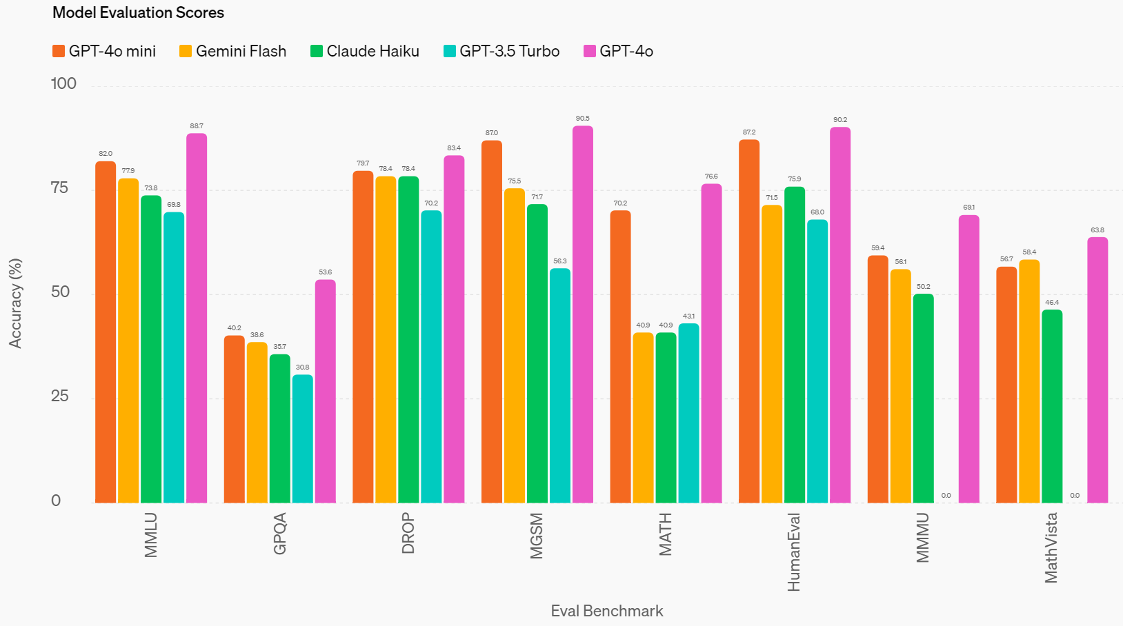 GPT-4o mini는 수학적 추론 및 코딩 작업에서 탁월한 성능을 발휘하여 시장에 출시된 이전 소형 모델들을 능가합니다. 수학 추론을 측정하는 MGSM에서 GPT-4o mini는 87.0%를 기록하여 Gemini Flash의 75.5%와 Claude Haiku의 71.7%를 능가합니다. 코딩 성능을 측정하는 HumanEval에서 GPT-4o mini는 87.2%를 기록하여 Gemini Flash의 71.5%와 Claude Haiku의 75.9%를 능가합니다. - 멀티모달 추론: