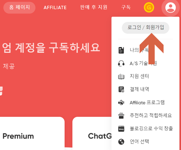 아래와 같이, 우측 상단의 로그인/회원가입 부분을 통해서 가입하시면 됩니다.
