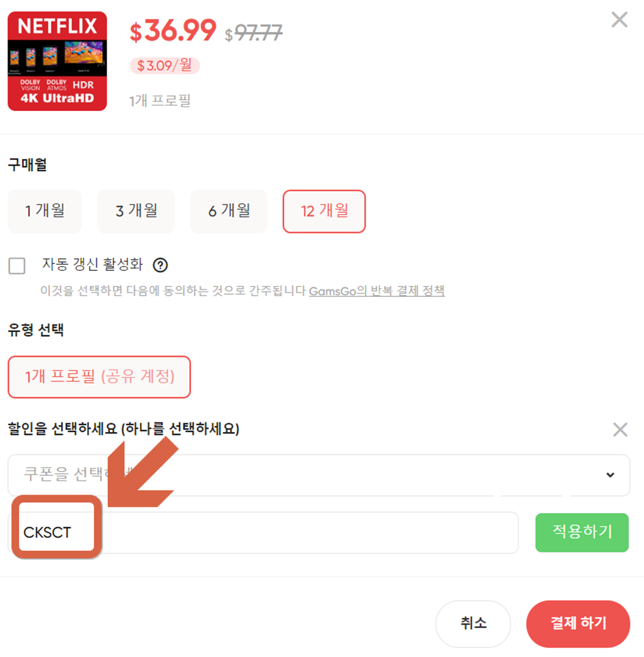 아래와 같이, 구독 월을 설정하고, 할인 코드는 “CKSCT” 를 입력하시면 추가 할인된 금액으로 구독하실 수 있습니다.