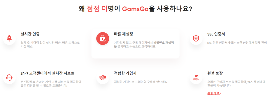 GamsGo는 개인정보 보호, 환불, AML(자금세탁 방지) 등 사용자 상호작용의 모든 측면을 포괄하는 잘 정의되고 포괄적인 정책을 제공합니다. 경쟁자들은 Alongshare와 Coosub처럼 이러한 정책을 그대로 복사했지만, GamsGo의 정책은 항상 최고 수준의 준수와 사용자 보호를 보장하기 위해 정기적으로 검토 및 업데이트됩니다.