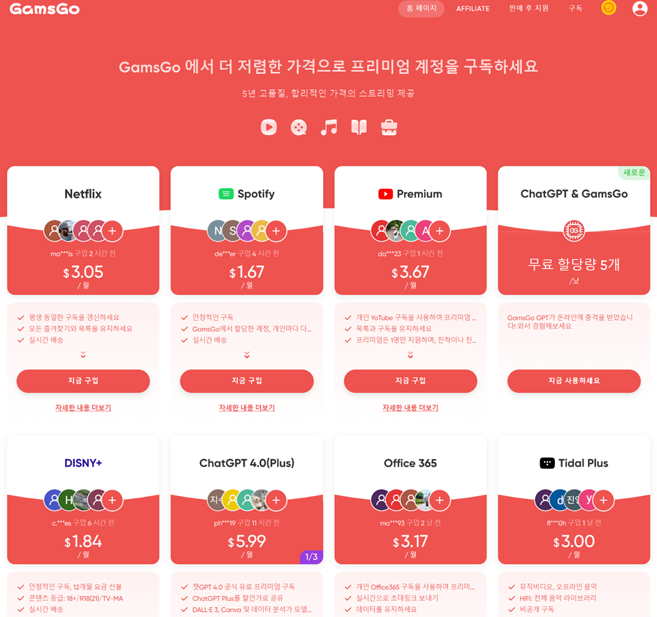 GamsGo는 편리하고 혁신적인 OTT 공유 플랫폼으로, 다양한 구독 서비스 경험을 한층 더 업그레이드하는 데 중점을 두고 있습니다.