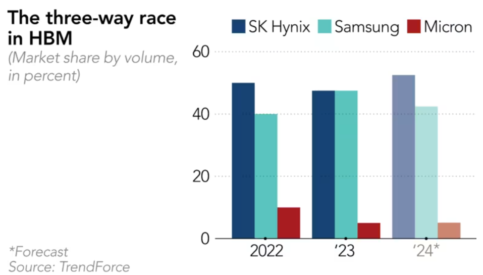 엔비디아는 ChatGPT와 같은 최첨단 생성형 AI 애플리케이션을 지원하는 GPU를 생산하고 있습니다. 이러한 GPU의 성능을 최대한 활용하려면 HBM이 필수적입니다. 현재 엔비디아는 주로 한국의 SK하이닉스로부터 HBM을 조달하고 있지만, AI 칩에 대한 수요가 급증함에 따라 공급 업체를 다변화하려 하고 있습니다.