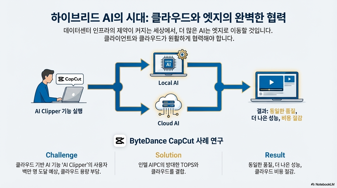 이처럼 강력해진 온디바이스 컴퓨팅 파워는 AI의 패러다임을 근본적으로 바꾸고 있습니다. 지금까지 AI는 강력한 데이터 센터의 클라우드 서버에서 실행되는 것이 일반적이었지만, Intel은 AI의 미래가 클라이언트와 클라우드가 협력하는 '하이브리드 AI'에 있다고 선언했습니다. Jim Johnson이 "하이브리드 AI 시대의 시작"이라고 명명한 이 변화는 이미 현실이 되고 있습니다. ByteDance의 동영상 편집 앱 CapCut은 클라우드에서 처리하던 AI 작업을 인텔 AI PC로 분산시켜 '동일한 품질, 더 나은 성능, 낮은 클라우드 비용'을 달성했습니다.