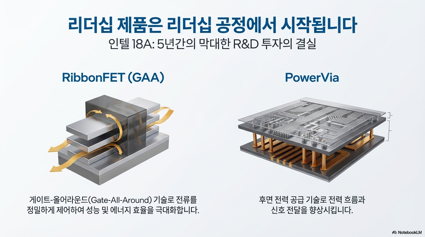 이 모든 발전의 기반에는 '리본펫(RibbonFET)'과 '파워비아(PowerVia)'라는 두 가지 핵심 신기술이 있습니다. 이 기술들은 트랜지스터의 성능과 전력 효율을 극대화하여 와트당 성능을 최대 15%, 칩의 집적도를 30% 이상 개선했습니다. 이것은 단순히 칩 설계를 잘한 것을 넘어, 반도체 제조라는 가장 근본적인 영역에서 Intel이 다시 한번 기술 리더십을 확보했음을 보여주는 강력한 증거입니다. 18A 공정의 성공은 앞서 언급된 모든 성능 향상을 가능하게 한 진정한 기반이며, 앞으로 몇 년간 PC 성능의 기준을 새롭게 설정할 것임을 시사합니다.