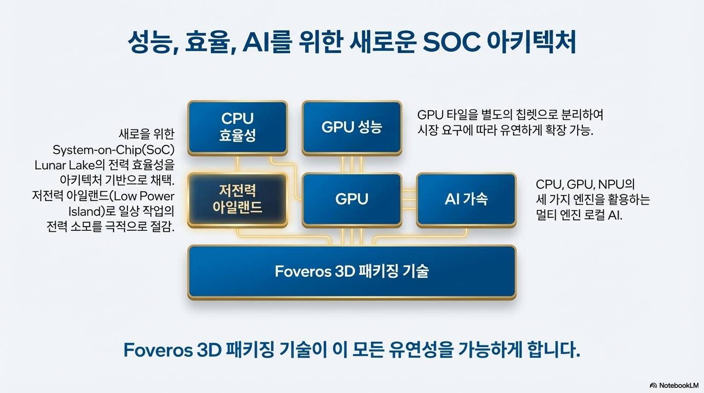 그들의 주장은 구체적인 데이터로 뒷받침됩니다. Core Ultra Series 3는 4K 비디오 스트리밍 시 이전 세대 대비 전력 소모가 1/3 수준으로 극적으로 감소했습니다. 이러한 혁신 덕분에 우리는 노트북 배터리 수명을 더 이상 '시간' 단위가 아닌 '일' 단위로 이야기할 수 있게 되었습니다. 더욱 중요한 것은 이것이 일회성 개선이 아니라는 점입니다. Intel의 Jim Johnson은 "Lunar Lake(Series 2)의 전력 효율성을 Series 3와 향후 로드맵의 아키텍처 기반으로 삼았다"고 밝히며, 이것이 다세대에 걸친 전략적 방향임을 분명히 했습니다. 이제 고성능 노트북은 더 이상 충전기에 얽매이지 않고, 전력 효율성이라는 가장 중요한 전쟁터에서 정면 승부를 벌일 준비를 마쳤습니다.