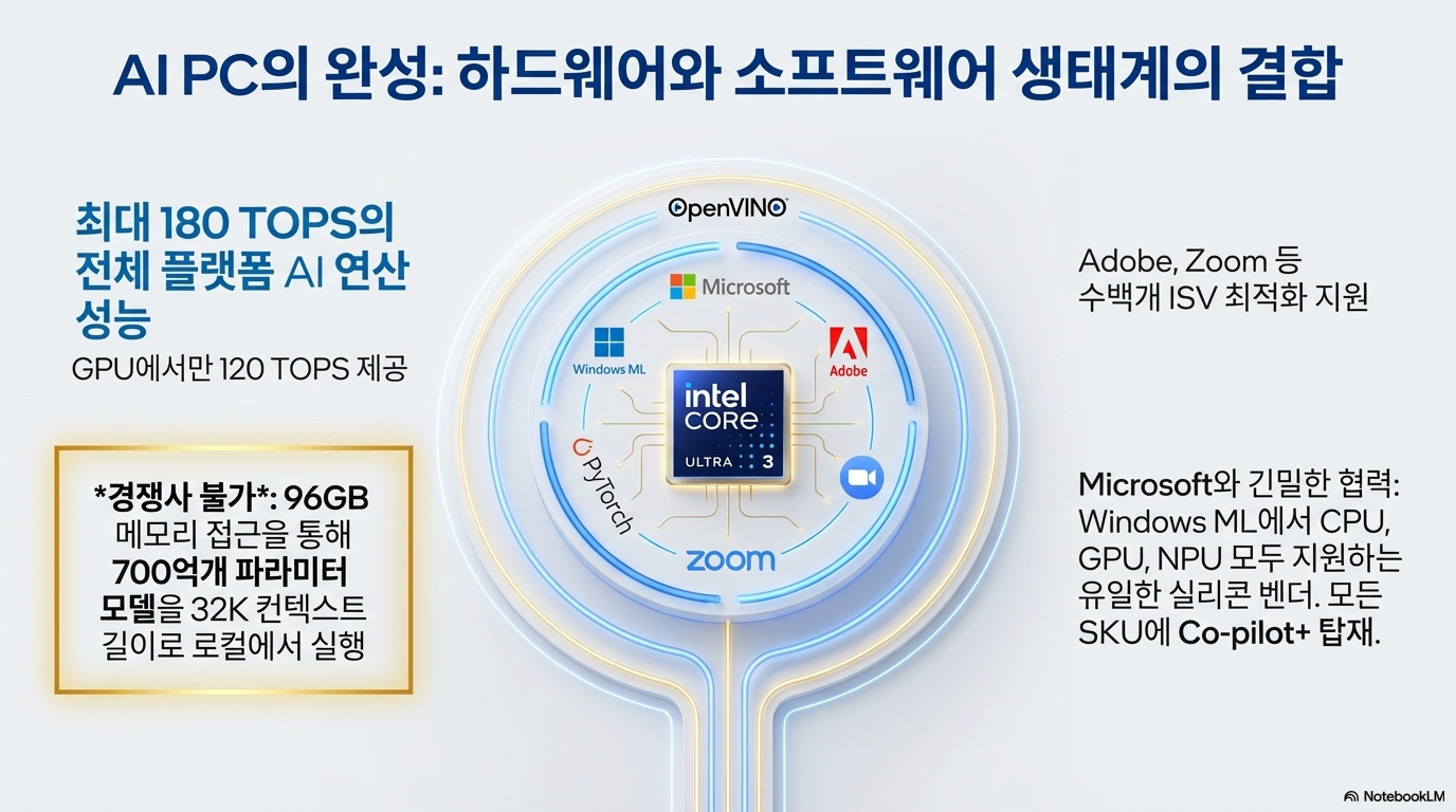 Intel은 이 칩이 '700억개 파라미터 모델'을 로컬에서 처리할 수 있으며, 이는 "다른 경쟁사는 할 수 없는 일"이라고 자신 있게 강조했습니다. 이것은 단순한 숫자 경쟁이 아닙니다. 과거에는 오직 클라우드 데이터 센터에서만 가능했던 전문가 수준의 거대 AI 모델을 이제 개인 PC에서 직접 구동할 수 있게 되었다는 뜻입니다. 이미 Adobe Premiere Pro에서는 영상 편집 시 "해변에서 일몰을 보는 장면"이라고 설명만 하면 AI가 즉시 해당 장면을 찾아내고, Zoom에서는 저전력 NPU를 활용해 사용자 얼굴에만 부드러운 조명을 비추는 '가상 링 라이트' 효과를 구현하는 등 실제 애플리케이션에 적용되고 있습니다. 이는 개발자와 크리에이터에게 무한한 가능성의 문을 열어주는 혁신입니다.