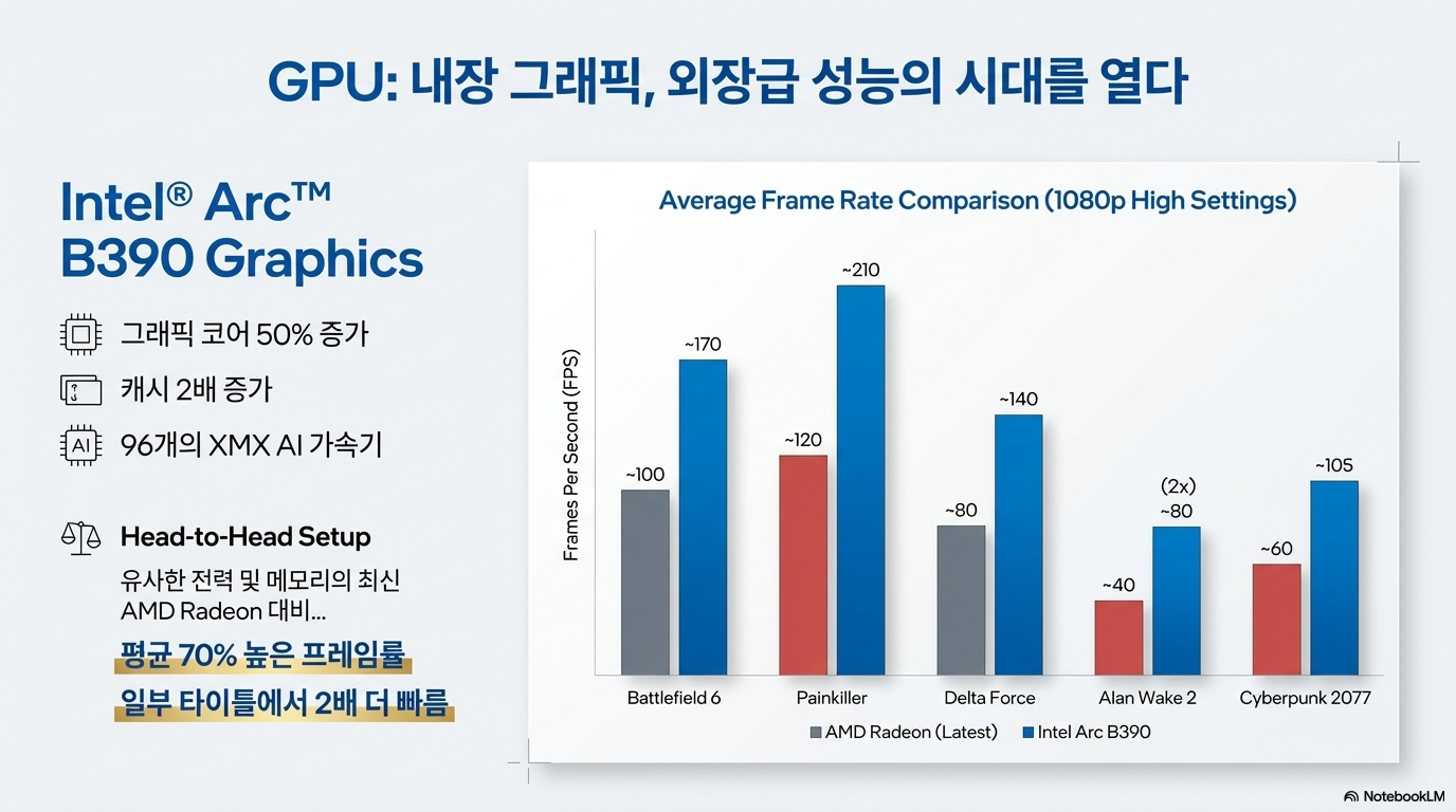 이번 발표의 진정한 게임 체인저는 코드명 Panther Lake로 알려진 Series 3에 탑재된 새로운 내장 GPU, 'Intel ARC B390 그래픽'입니다. 이 칩은 이전 세대인 Lunar Lake(Series 2) 대비 70% 향상된 게이밍 성능을 자랑하며, 전반적인 CPU 성능 역시 60%나 뛰어올랐습니다. 경쟁사와 비교하면 그 격차는 더욱 놀랍습니다. 유사한 전력의 최신 AMD Radeon 제품보다 평균 70% 더 높은 프레임률을 기록한 것입니다. 여기에 세계 최초로 AI 기반 멀티프레임 생성을 지원하는 내장 그래픽이라는 기술적 이정표까지 세웠습니다. 세계적인 게임 개발사 EA의 Jeff Skelton은 이 성능에 대해 다음과 같이 평가했습니다.