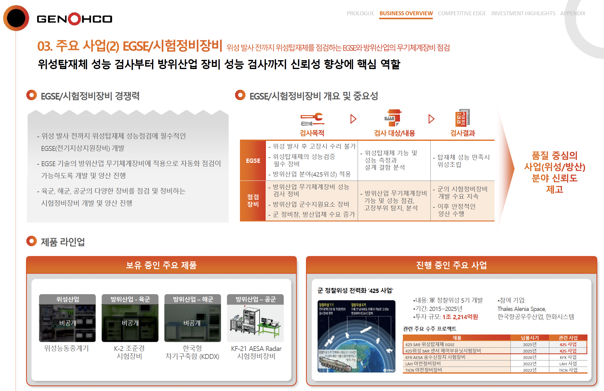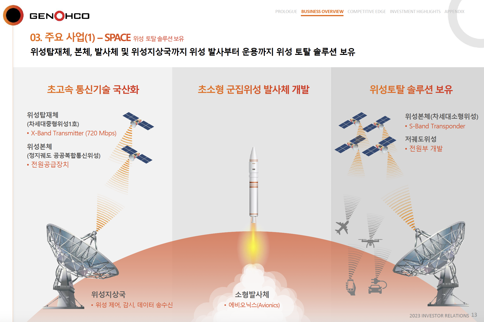 제노코는 2004년에 설립된 이후, 위성통신 및 항공 방산 전자 부품 개발과 생산에서 두각을 나타내며 꾸준히 성장해온 기업입니다. 제노코의 주요 사업 영역은 크게 세 가지로 나눌 수 있습니다. 첫째, 위성용 시험 장비 개발입니다. 이는 위성통신 및 위성 운용에 필수적인 테스트 장비를 개발해, 위성 장비의 성능과 안전성을 확보하는 데 중요한 역할을 하고 있습니다. 둘째, 지상국 설치로, 이는 위성에서 보내는 신호를 지상에서 수신하고 관리하는 시스템을 구축하는 작업을 포함합니다. 제노코는 이 과정에서 얻은 기술력으로 국내 위성통신 인프라의 중요한 축을 담당하고 있습니다. 마지막으로, 우주 및 방위 산업의 주요 부품 개발 및 생산으로, 이는 국가 안보와 우주 산업 발전에 기여하는 핵심 분야입니다.