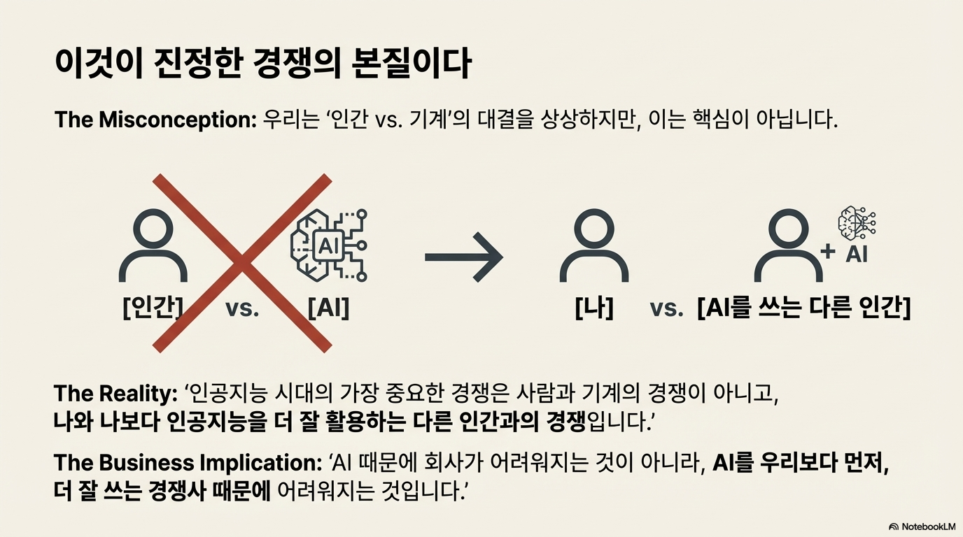 진정한 경쟁은 바로 ‘나’와 ‘나보다 AI를 더 잘 활용하는 다른 인간’ 사이에서 벌어집니다.