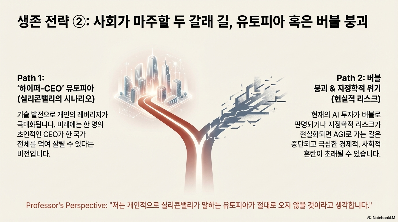 김 교수는 AGI가 지적 노동을 자동화하고 대량 생산하게 되면, 생산 함수에서 ‘노동의 가치’가 궁극적으로 0에 수렴할 수 있다고 경고합니다. 노동의 가치가 사라지면, 상대적으로 자본의 가치는 무한대로 급등하게 됩니다. 이는 노동으로 생계를 유지하는 대다수에게 치명적인 위협입니다. 김 교수는 이 새로운 시대의 생존 전략을 명확하고 단호하게 제시합니다.