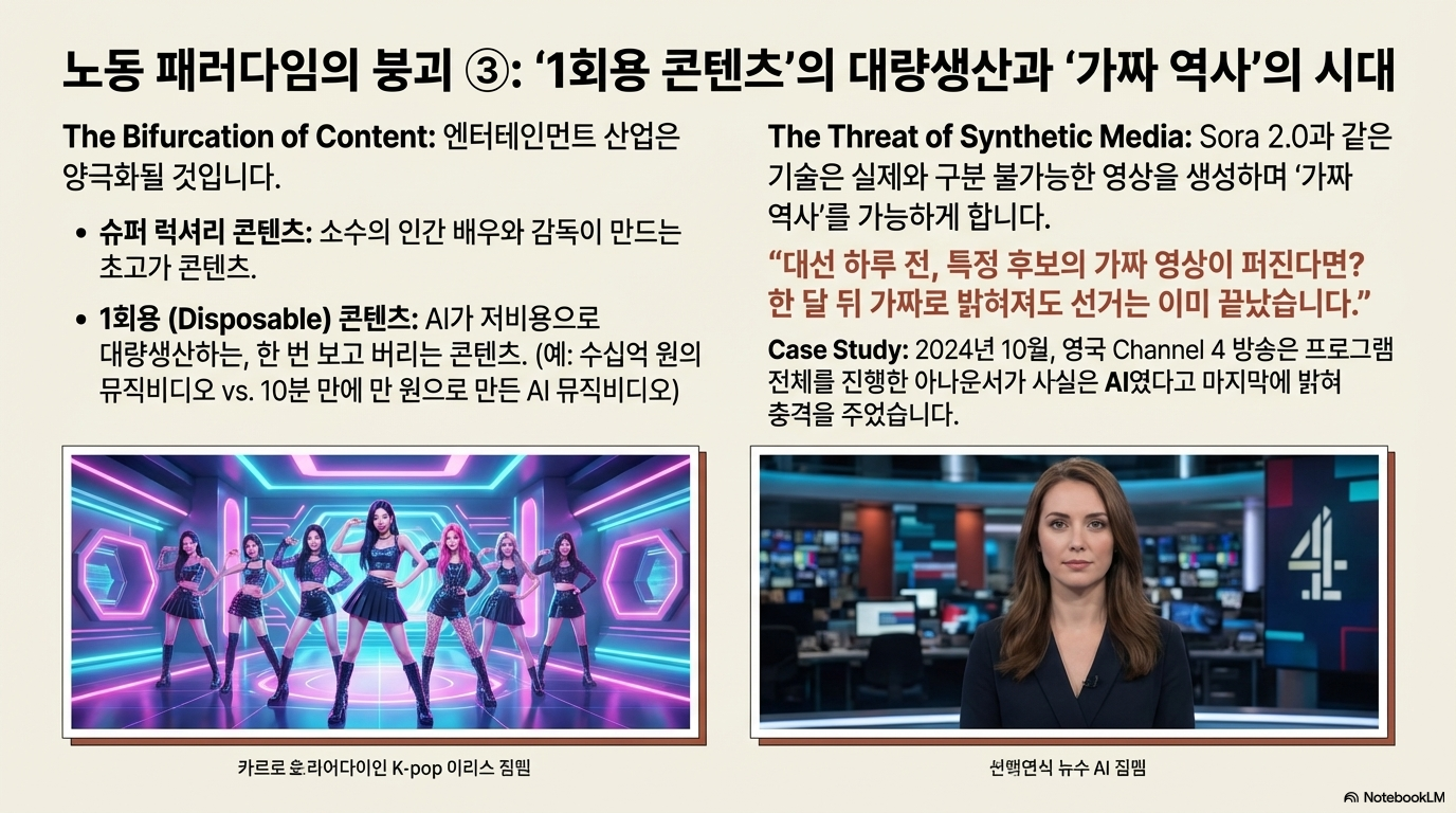 이 기술은 콘텐츠 산업을 양극화시킬 것입니다. 자동차 산업에 부가티와 람보르기니가 있듯, 인간이 직접 만드는 소수의 **‘슈퍼 럭셔리 콘텐츠’**가 존재할 것입니다. 하지만 나머지 대부분은 AI가 대량 생산하는, 한 번 보고 버리는 **‘1회용 디스퍼지블 콘텐츠’**가 될 것입니다. 할리우드 스튜디오의 절반이 비어있고, 수천억 원의 영화 제작비가 수십억 원으로 줄어드는 현실이 이를 증명합니다.