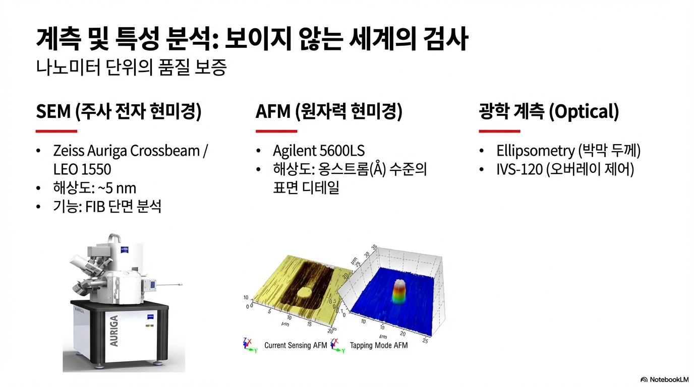 • 광학 계측: Rudolph S-200 및 SCI FilmTek 2000은 투명 박막의 두께를 측정하며, IVS-120은 나노미터 수준의 오버레이 정밀도 제어에 사용됩니다.