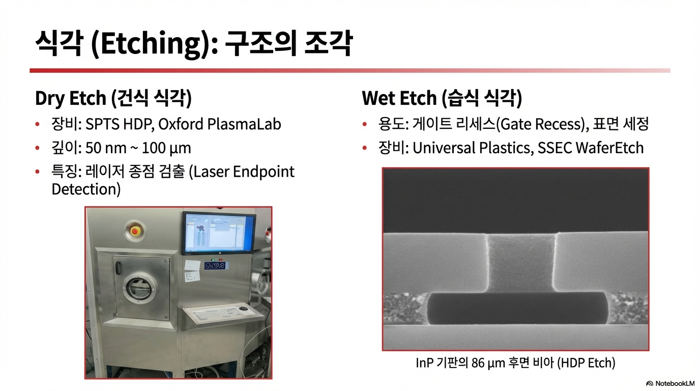 HFTC의 건식 식각 기술은 GaAs, InP, SiO₂, Si₃N₄ 등 다양한 재료를 나노미터 수준에서 정밀하게 가공하는 데 사용됩니다. 120nm에서 60µm까지의 CD와 50nm에서 100µm까지의 식각 깊이를 정밀하게 제어합니다. SPTS HDP 에처, SPTS Omega RIE 에처, Oxford PlasmaLab100 클러스터 툴, VEECO 이온 밀 시스템 등 다양한 장비를 보유하고 있으며, 레이저 종말점 검출, 고온 식각 등 고급 기능을 통해 공정 정확도를 극대화합니다.