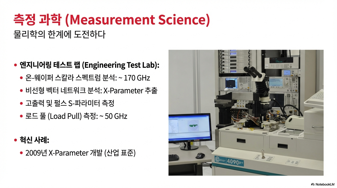 HFTC는 측정된 데이터를 등가 회로(compact model), 행동 모델(neural networks), S-파라미터 및 X-파라미터 등으로 해석하여 정확한 모델을 정의합니다. 특히, HFTC는 2009년 S-파라미터를 수학적으로 확장한 X-파라미터를 개발하여 업계 표준을 선도했습니다. X-파라미터는 기존 S-파라미터와 달리 비선형성, 다중 톤(multi-tone), 비-50옴 임피던스 조건까지 포함하여, 과거에는 모델링이 불가능했던 소자의 복잡한 실제 동작을 정확하게 예측합니다. 이 혁신은 설계자들이 훨씬 높은 신뢰도로 시뮬레이션을 수행하게 함으로써, 비용이 많이 드는 실리콘 재작업(respin)의 위험을 크게 줄이고 전체 제품 개발 수명 주기를 가속화하는 핵심 동력이 됩니다.
