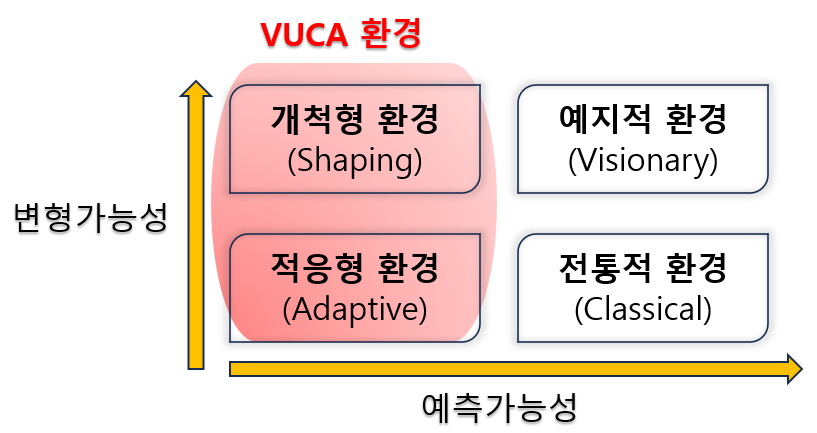 예측 가능성이 낮은 개척형 환경과 적응형 환경이 VUCA 환경에 해당합니다.