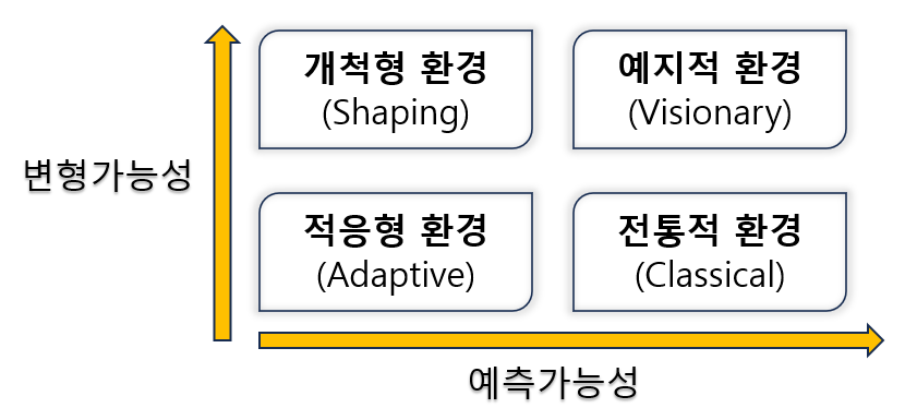 예측 가능성과 변형 가능성의 수준에 따라 개척형 환경(Shaping), 예지적 환경(Visionary),적응형 환경(Adaptive), 전통적 환경(Classical) 4가지 유형으로 분류할 수 있습니다.